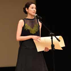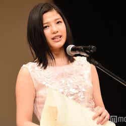 およそ1万人が参加したオーディションを経て出演を決め、2014年夏に行われた同グループ初のアリーナツアーへの参加を諦め覚悟を決め撮影に挑んだ「ソロモンの偽証 前篇・事件」(2015年3月公開)「ソロモンの偽証 後篇・裁判」(同年4月公開)でのいじめられっ子の怪演や、個人としてもE-girlsの中でも初めて映画主演を務めた「ガールズ・ステップ」(同年9月公開)の演技で同賞を射止めた石井。スパンコールが散りばめられた淡いピンクドレスを纏い壇上に上がると、会場に詰めかけたファンからは「安奈ちゃ~ん」と歓声もあがった。
