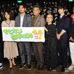 モヒカン頭がトレードマークの売れないバンドマン永吉(松田)が恋人の由佳(前田)を連れ、結婚報告のため7年ぶりに故郷・広島に帰ると父・治(柄本)のガンが発覚する同作。父の最期を幸福で包むために何でもやってあげたいと、母・春子(もたい)と弟・浩二(千葉)とともに、不器用ながら一家総出で奮闘するホームドラマとなっている。夫婦役を演じた松田について前田は、「客観的に見ていて、永吉と龍平さんはかなり近いんじゃないかなと思います」と打ち明け、「ダメダメなところではなく、素に近い龍平さんがこの映画の中で見られるんじゃないかなって思いました。自分の言ったことにヘラヘラ笑うところが可愛いなと思いました(笑)」と告白。松田は「いつも素みたいって言われるので嬉しいですね」と喜んだ。