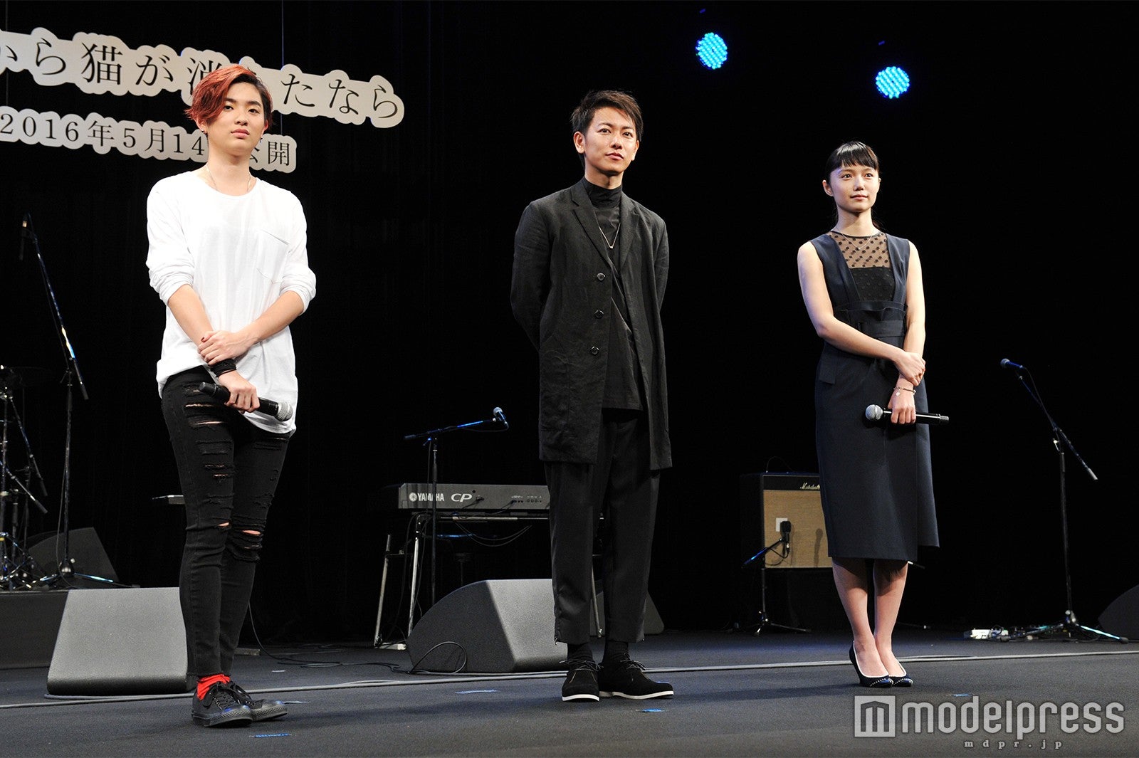 俳優の佐藤健が1日、都内で行われた映画「世界から猫が消えたなら」(5月14日より全国公開)のイベント試写会に、女優の宮崎あおい(※「崎」は正式には「たつさき」)、新人アーティストのHARUHIとともに登壇。イベントでは言葉をど忘れした宮崎を佐藤がすかさずフォローする一幕があった。