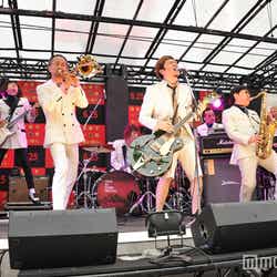 俳優の綾野剛が22日、都内で行われた映画「日本で一番悪い奴ら」(6月25日公開)のイベントに出席。サプライズゲストとして登場した東京スカパラダイスオーケストラ feat. Ken Yokoyamaが、同作の主題歌「道なき道、反骨の。」(6月22日発売)を披露すると、「カッコいいっすねえ」と目を輝かせた綾野。「谷中(敦)さんと横山(健)さんの間に立っていること自体、今、日本で1番悪い状態(笑)。今年1番楽しいです!」と感激していた。
