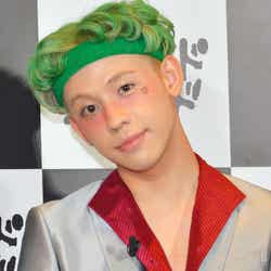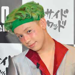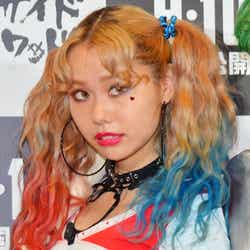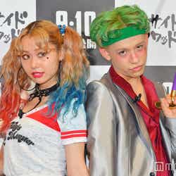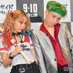 そんなスーパーヒーローたちが手を焼いた悪党たち=ヴィランズの中でも、最高にクレイジーでポップなビジュアルの“悪党カップル”ハーレイ・クインとジョーカーに扮して登場したぺこ&りゅうちぇる。「メイクを再現して私らしくスカートにしました。ロックな悪い感じ」(ぺこ)、「ジョーカーのかっこよくて怖い感じに、僕らしくヘアバンドを合わせました。いつも金髪なんですけど、カラーチョークで髪色も変えたりしたので、ウキウキです!」(りゅうちぇる)とそれぞれポイントを語った。(modelpress編集部)