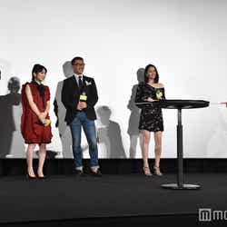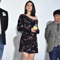 長澤は左肩が落ちたSEXYなオフショルダーのミニワンピースで登場。アナウンサー役を演じた感想を聞かれると、撮影が始まる前に監督から「アナウンサーさんは華やかで、笑顔の裏には多大なる苦労がある。その中でも頑張って前に進んでいく勇気と言いますか、女性の武器を使って勝負しようという姿をきちんと演じてもらいたい」と言われたそうで、「同じテレビの世界でも全然違う畑なんだなって感じましたし、それを楽しく面白く演じさせてもらえたのは楽しかったなと思います」とコメント。さらに「自分がもしアナウンサーになるって考えたら、毎日の生(放送)の緊張感に耐えられないですね」と吐露し、「私は話が下手なのでどこで終わればいいのか分からなくて、時間を食って『あいつ使えねえ』ってなって、ダメになって行きそうな気がします」と想像し、会場を沸かせた。