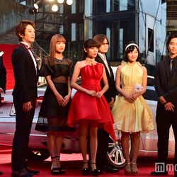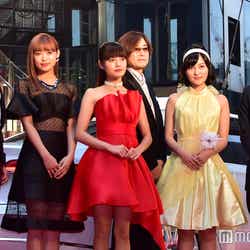映画「イタズラなKiss THE MOVIE~ハイスクール編~」に出演する美沙玲奈、山口乃々華、灯敦生もレッドカーペットに。真っ赤なドレスの美沙、ブラックのSEXYな透けドレスの山口、イエローのドレス姿がまぶしい灯と、それぞれの出で立ち。主演の劇団EXILE・佐藤寛太、大倉士門らと仲睦まじげに歩いた。