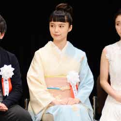 25日、都内にて日本映画界に貢献した作品や人物を称える「第40回 山路ふみ子映画賞」贈呈式が行われ、「怒り」で同女優賞を受賞した宮崎あおい(※「崎」は正式には「たつさき」)と、「猫なんかよんでもこない。」などで同新人女優賞を受賞した松岡茉優が登壇した。