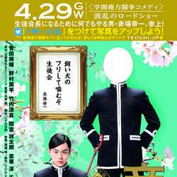 日本一の名門・海帝高校を舞台に、「総理大臣になって、自分の国を作る」という野望を抱く赤場帝一(菅田)らが命がけの生徒会選挙を繰り広げる異色の学園コメディ。今回公開された劇場スタンディビジュアルは、帝一が犬(忠犬)になった「飼い犬の フリして噛むぞ 生徒会」バージョンと、帝一が飼い主になった「会長選 君が負けたら 犬になれ」バージョンの2種。どちらも顔抜きパネルとなっており、帝一を犬にするか、飼い主にするか…。