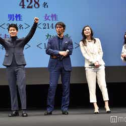 同作は、息子が独立して25年ぶりに夫婦2人きりで生活することになった中学校教師の宮本(阿部)が、ある日、妻・美代子(天海)が隠し持つ離婚届を偶然発見してしまうものの、妻に問いただす勇気もなく、人生について悩み葛藤しながらも教え子や教師仲間と関わる中で家族の在り方について再認識して妻と新たな一歩を踏み出していくというストーリー。イベントでは、作品にちなんで、会場に集まった夫婦137組、カップル77組の総勢428名の観客を対象に、トータライザーを使った実態調査も実施。早見は「いってらっしゃいやおはようのキスをしている方」と質問した。