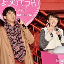 俳優の中川大志とモデルで女優の飯豊まりえが13日、東京タワーで行われた映画「きょうのキラ君」(2月25日より全国公開)のヒット祈願バレンタインイベントに出席した。