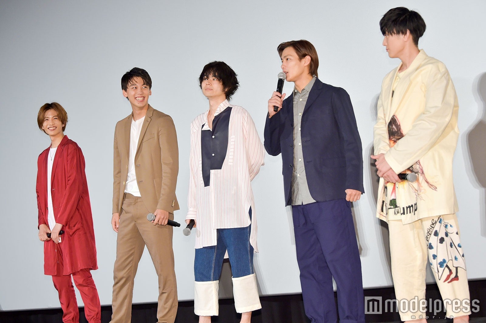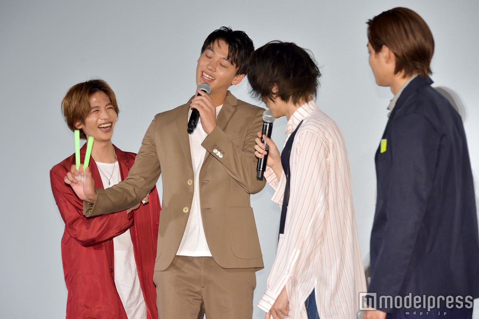 今回の舞台挨拶が、キャスト揃う最後の公式イベントということで、“卒業セレモニー”としてキャストから菅田へメッセージ。竹内、志尊、間宮の順で向かい合って思いを明かし、竹内と志尊はハグ、間宮は首元にキス。菅田は「チュッチュすんな!(笑)」と笑い、会場は盛り上がった。