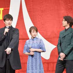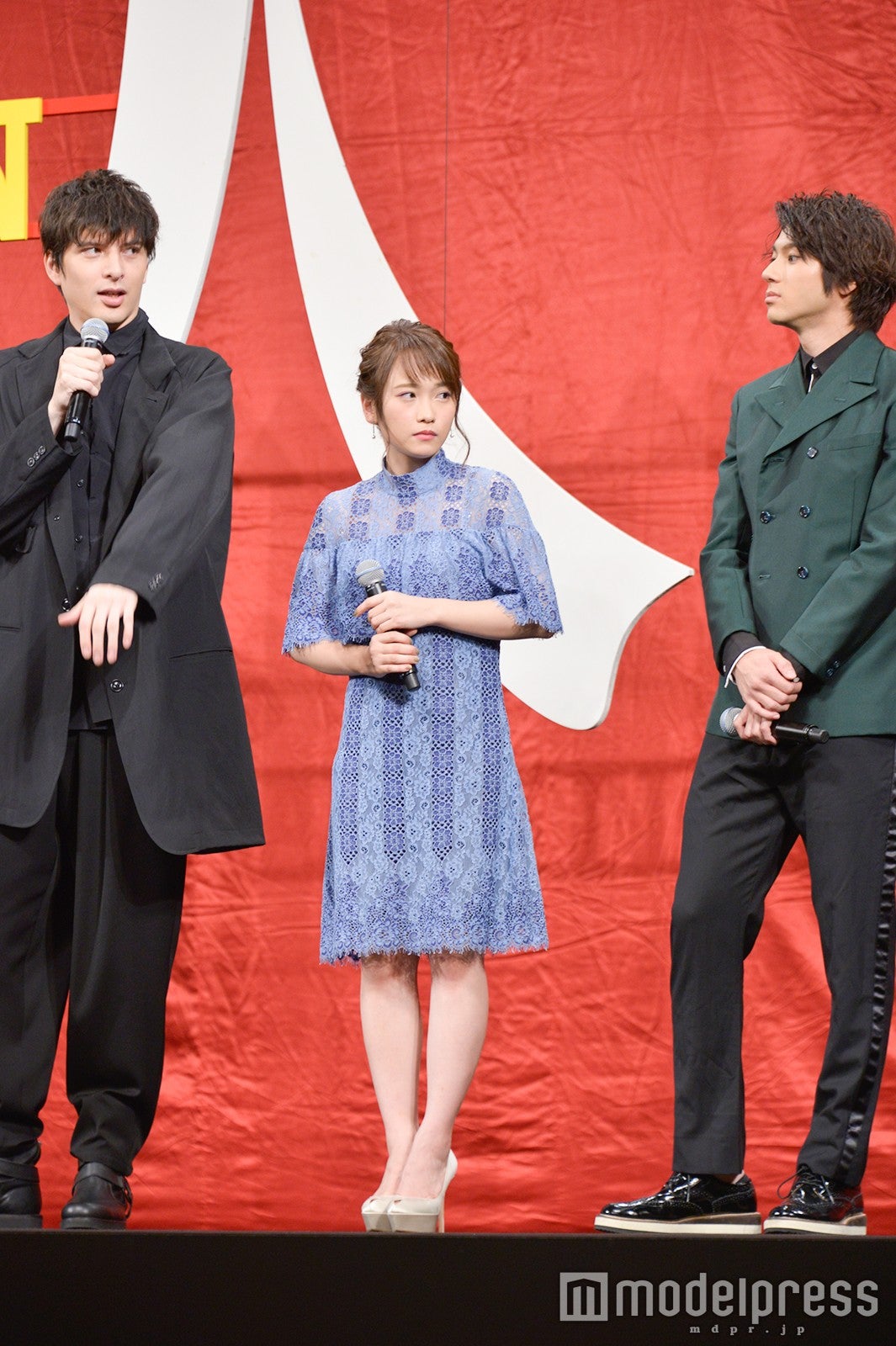 佐藤は「今回はやられ役だったので、高いところから落ちたり痛い思いをた。撮影終わったら、2センチくらい首が縮みました」と明かした。また、首をすくませて実演しつつ「剛に(首を)引っ張ってもらった」と綾野が助けたとし、会場の笑いを誘っていた。