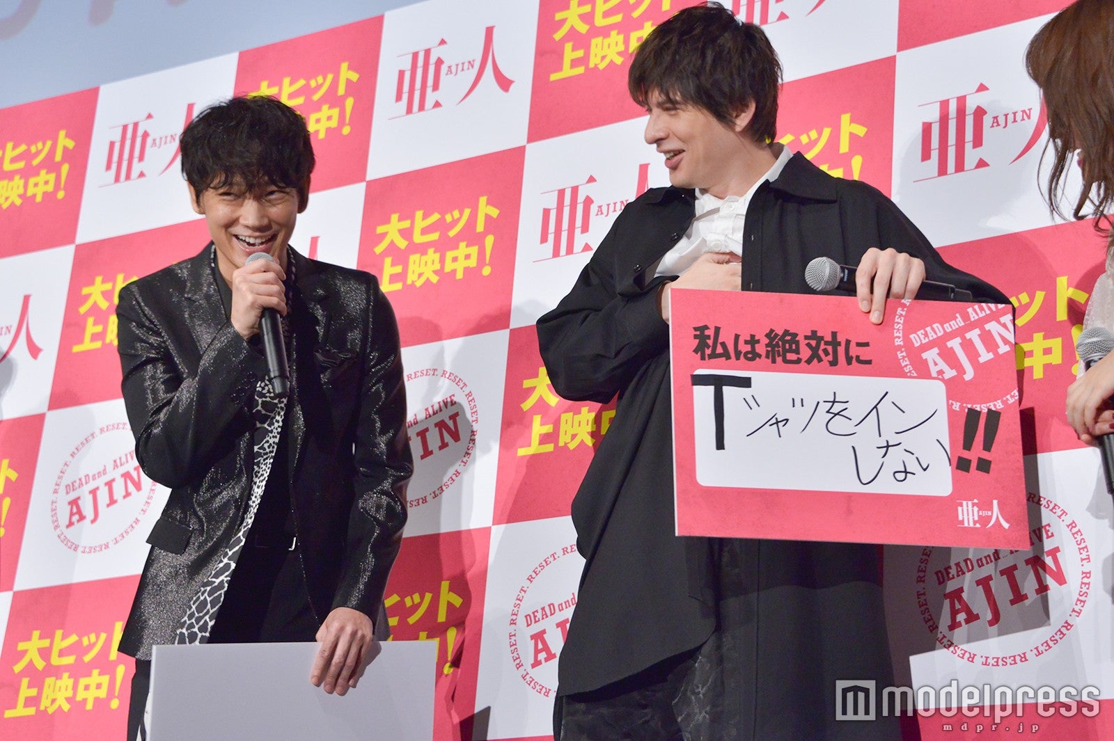 この日、亜人が不死身なことにちなんで、“今後絶対しないこと”をそれぞれ登壇者が発表。佐藤は「写真撮影断りません!」を掲げ、綾野や城田に心配されてしまう一幕があった。佐藤は、亜人の公開中に限り、「街であった人に(撮影を)頼まれたら断りません!」と約束し、会場からどよめきと拍手が起きた。綾野は「知らねえぞ…」と不安視し、城田も「本当に大変なことになるよ?1人がはじまったら100人くらいくるよ?」と心配。綾野は「じゃあ状況次第だね。芝居中とか集中してるときとか以外とか…」と提案するも、佐藤は「ダメだよ!断らないもん。いつでも撮って。隠し撮りでもいい」と頑なに許可。