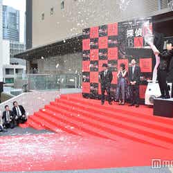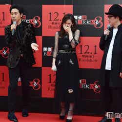 また、今回もコンビとして共演した松田が作品の感想を聞かれ、言葉少なに「探偵を見ていたいなと…」と答えると、大泉は「僕が拷問されるシーンが好きみたい」と補足し、松田は「大泉さんが辛ければ辛いほど(楽しい)」とニッコリ。前作に比べアクションシーンが本格的になっているそうで、これまで同シリーズの大ファンだったという前田も「高田さんってこんなに動けるんだ、カッコイイって思いました」と松田のアクションを絶賛。松田は「嬉しいです」と感謝していた。