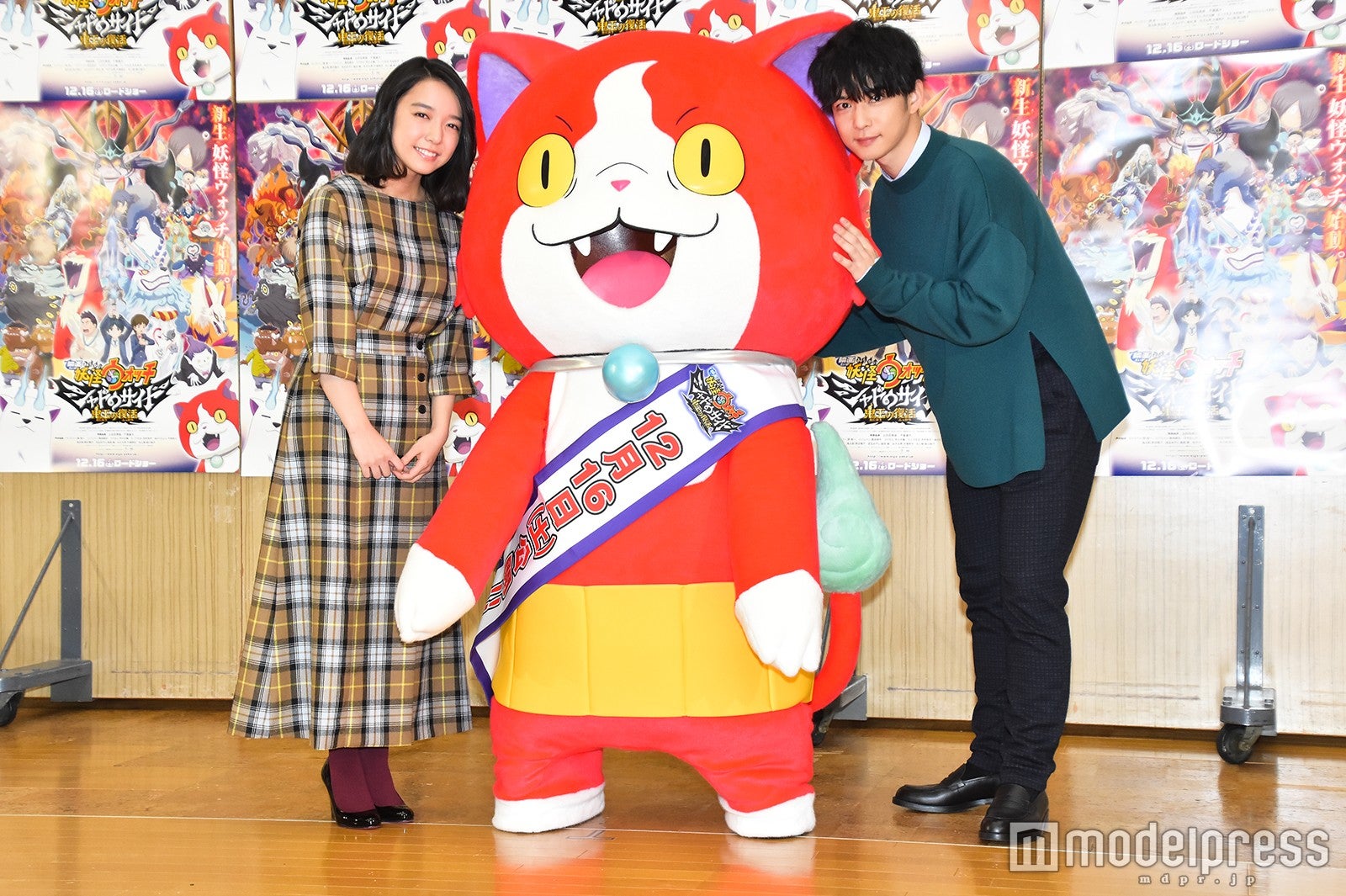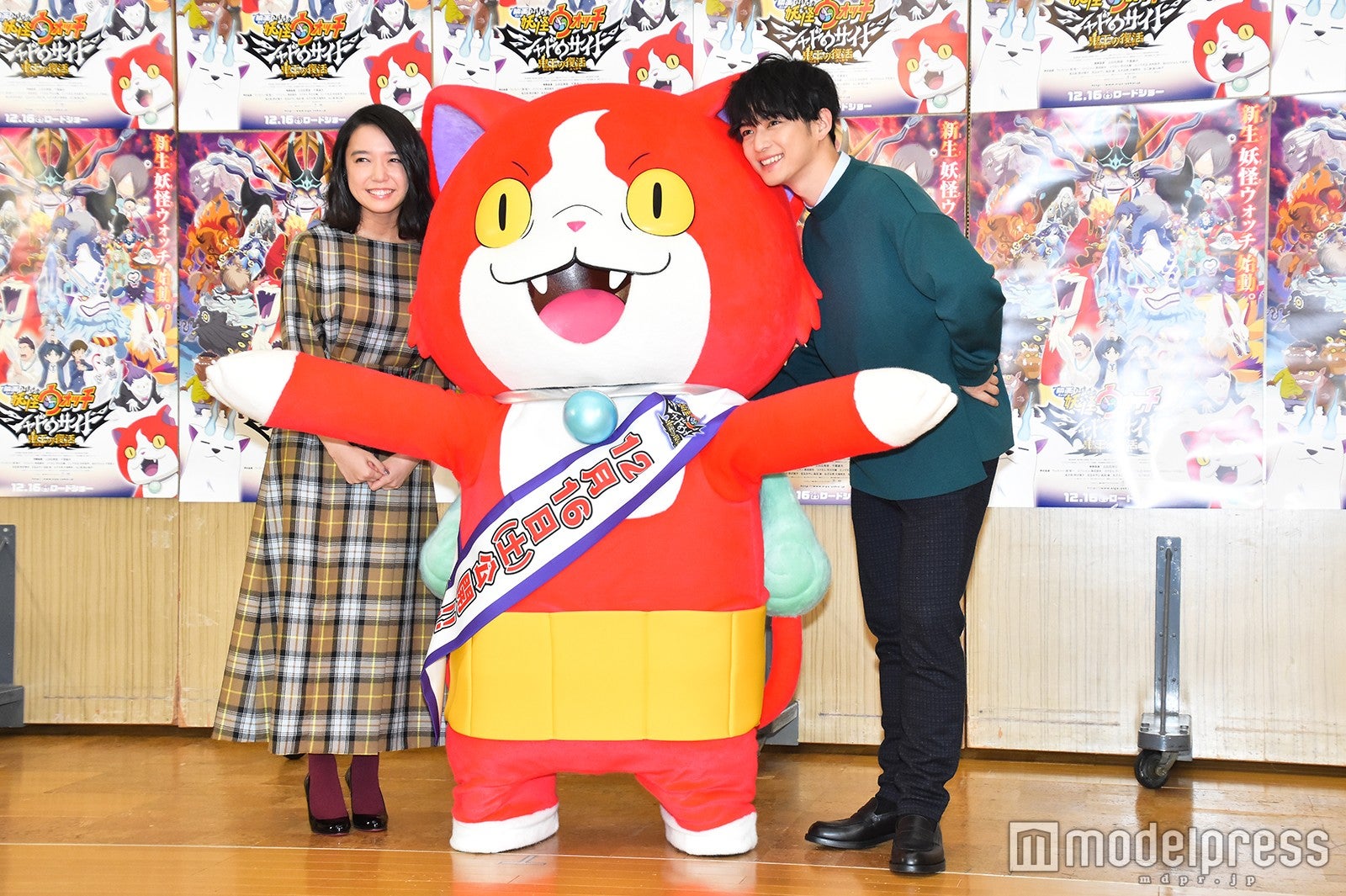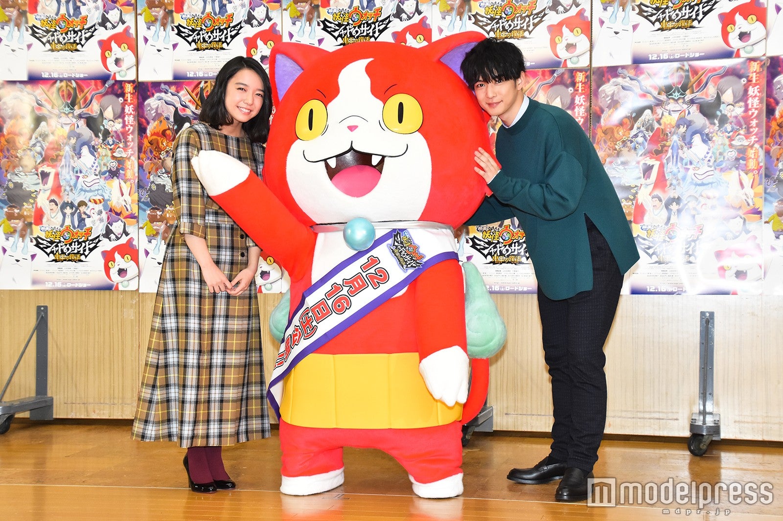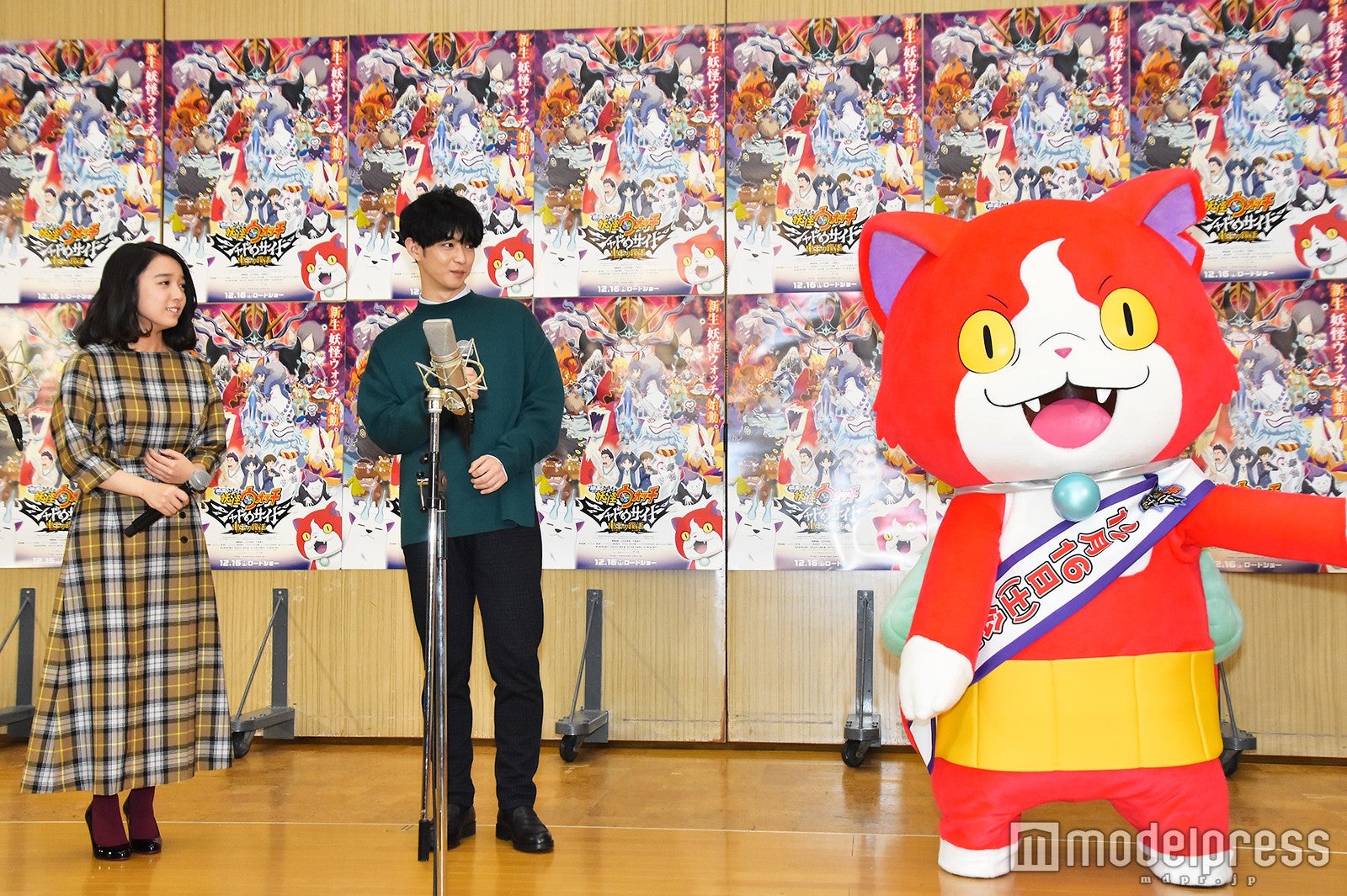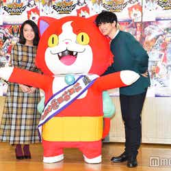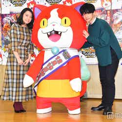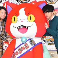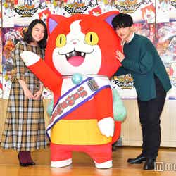 人気シリーズの劇場版第4弾で、テレビアニメでの主人公・ケータの時代から30年後の世界が舞台。登場人物は一新されており、ケータの娘で、同作の主人公・天野ナツメを上白石、もう一人の主人公・月浪トウマを千葉が演じる。大勢の報道陣の前でアフレコを行うため、2人は登場時から緊張気味。そんな2人の前に、30年の時を経て“伝説の猫妖怪”となった新・ジバニャンが駆けつけた。風貌もガラリと変わり、お馴染みの可愛らしい声も渋い野太い声となったジバニャン。「30年の間に色々あったニャン」と挨拶すると、上白石は「これは相当何かあった…」と苦笑していた。
