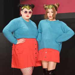 続いて、モデルのれいぽよ(土屋玲奈)とみくぴがペアルックで登場。れいぽよは「ペアに揃えて来たのですが、(トップスを)インしているところと、アウトしているところで変えました」とアレンジのポイントを紹介。みくぴは「同じサイズなのですが、お腹が出過ぎてインしています」と笑いを誘った。
