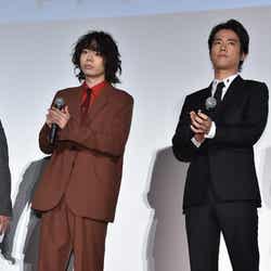 俳優の菅田将暉、桐谷健太が23日、都内で行われた映画「火花」の初日舞台あいさつに川谷修士(2丁拳銃)、三浦誠己、板尾創路監督、原作者の又吉直樹(ピース)と登壇した。