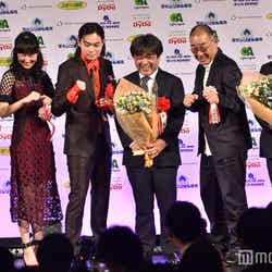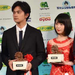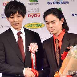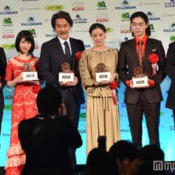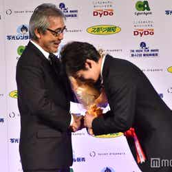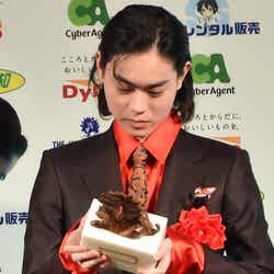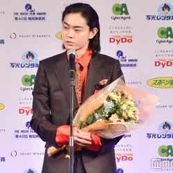 4作品(「あゝ、荒野」「キセキ-あの日のソビト-」「帝一の國」「火花」)で主演男優賞を受賞し、「あゝ、荒野」が作品賞・邦画部門にも輝いた菅田。赤いシャツにスーツを纏い登場した。蒼井優