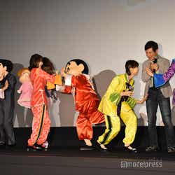 劇場版シリーズ26作目となる本作は、カスカベ防衛隊が伝説のカンフー「ぷにぷに拳」の修行に励むとともに、食べた人を凶暴化させてしまうラーメンの謎に迫る“おバカカンフーアクション”。ももクロが主題歌『笑一笑~シャオイーシャオ!~』と挿入歌を担当しているほか、ゲスト声優も務めている。玉井は「物心ついたときから『クレヨンしんちゃん』は身近に感じていた。主題歌をやらせていただくだけで本当に嬉しい。野原家の皆さんと一緒にステージに立てて嬉しく思う」と満面の笑み。百田も「豪華な皆さんと(初日を)迎えられて嬉しいです」と喜んだ。