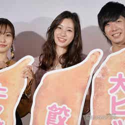 女優の足立梨花、BOYS AND MEN(通称:ボイメン)の田村侑久、モデルで女優の佐野ひなこが23日、都内で行われた映画「キスできる餃子」(公開中)の公開記念舞台挨拶に秦建日子監督と出席した。