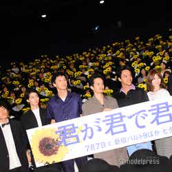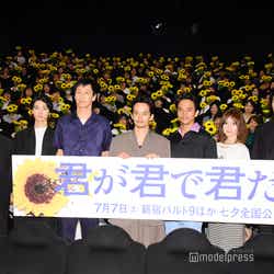 俳優の池松壮亮が26日、都内で行われた主演映画『君が君で君だ』(7月7日公開)完成披露舞台挨拶に、共演者の満島真之介、大倉孝二、高杉真宙、向井理、YOU、そしてメガホンをとった松居大悟監督とともに出席した。