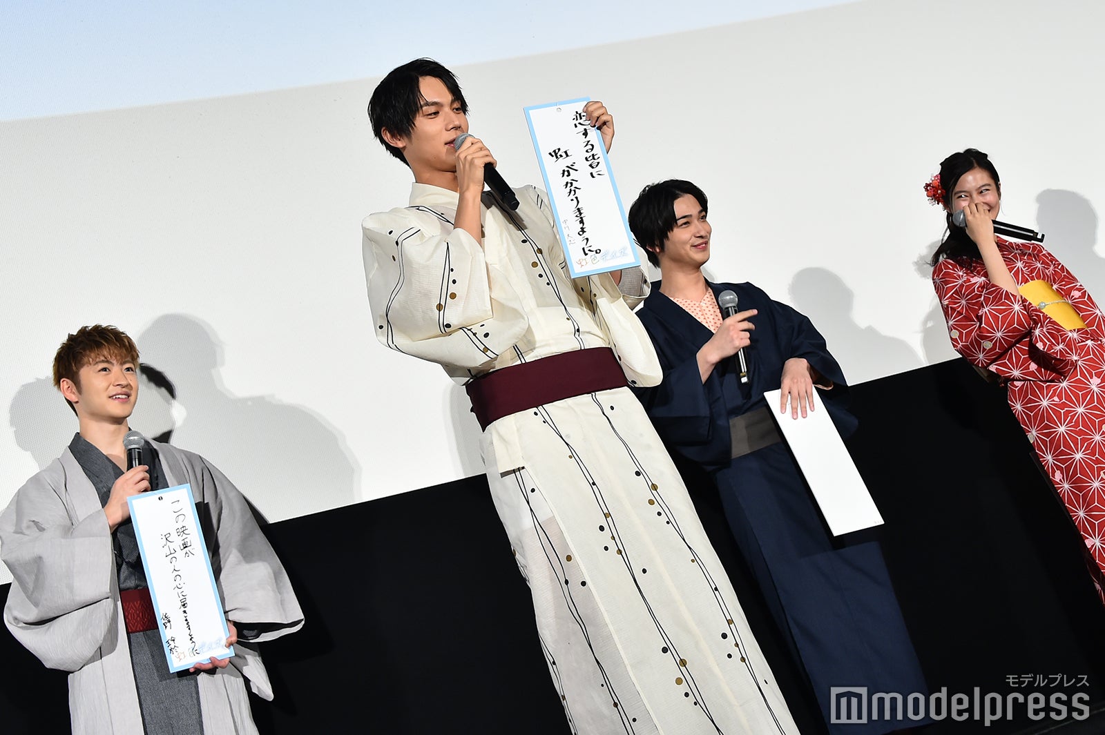 また、“虹色七夕祭り”とあって、キャスト陣は浴衣で登場し、それぞれが短冊に願い事を書いて披露。「この映画がたくさんの人の心に届きますように」と座長らしく願いを語った佐野だったが、個人的な願いを追求されると「バカンスしたいな~」としみじみ。「海外に。ハワイとか諸島に行きたい」とリアルな願望を告白するも「どうもね~、今行けない」と願いは叶いそうにない様子。イベント中終始仲良しぶりを見せていた高杉と2人でバカンスに行ってみては?と提案されると、中川はまたも「いいよ、2人で行ってきなよ」といじけてみせるなど、和気あいあいだった。