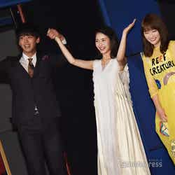 同作のキャッチコピー“革命的ラブコメディ”に引っ掛け、キャスト陣はそれぞれ自身の“革命的出来事”を発表。川栄は、竹内のファンだという母親について「母が更年期なんですね。すごいピリついてるんですけど、竹内くんの写真展(「竹内涼真写真展 unreleased –photo by Akinori Ito-」)に行ったら、一緒に行ったお姉ちゃんから『更年期のママがすごいニコニコ写真展を見てたから、竹内くんにありがとうって言って』って言ってて、更年期すらも癒やす竹内涼真すごいって思いました。医者以上。本当に感謝しかないです」とエピソードを披露。客席から拍手が起こると、佐藤も「僕の母も(竹内の)写真集(「Ryoma Takeuchi」)を買ってました」と明かし、「本当に色んな人を虜にしていますよ」と太鼓判。竹内は「嬉しいですね。これからもお仕事頑張ります」と照れくさそうな笑顔を浮かべつつ、感謝していた。