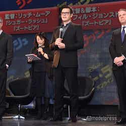 また、吹き替えをする上で意識した点を聞かれた菜々緒は「まず英語と日本語は発音の仕方だったり、リズムが全然違って、英語ってリズムがあって抑揚があるんですけど、日本語って割と淡々と喋るので、自分の日本語をどうマッチさせて行くかというのを考えながらやらせていただきました」と打ち明け、ムーア監督が絶賛した歌については「こんなにべた褒めしてもらうことなんてなかなかないので、すごい嬉しさと、恥ずかしさと、あまりにも褒められすぎて“本当かな?”っていう怪しむ気持ちも若干出てきてしまいました(笑)」と吐露。疑いの目を向けられたムーア監督は「心から思っています!」と力を込めた。
