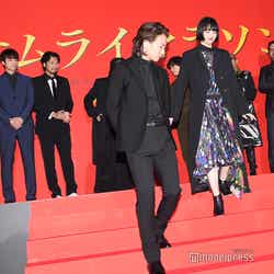 俳優の佐藤健と女優の小松菜奈が21日、都内にて行われた映画『サムライマラソン』(2月22日公開)完成披露イベントに森山未來、染谷将太、青木崇高、竹中直人、小関裕太、木幡竜、バーナード・ローズ監督とともに出席した。