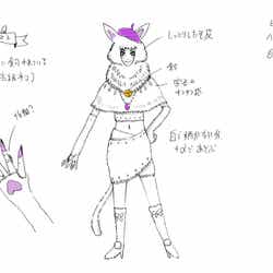 解禁されたデザイン画には、ベレー帽を被り、凛としたたたずまいのホワイテストが描かれており、「しっとりした毛皮」という猫スーツの材質の指定から、猫の種類のイメージなどのコメントなど細かい監督のイメージが書き込まれている。実際の飯豊が扮するホワイテストとは若干デザインが異なるものの、「白で柄がない分、+αであそぶ」「宝石やキラキラ感」というデザイン画のコメントのエッセンスはそのままに、ベレー帽を髪飾りに変更し、鈴を銀にするなど、より統一感が出て洗練された姿は、まるでデザイン画から飛び出してきたような印象となっている。(modelpress編集部)