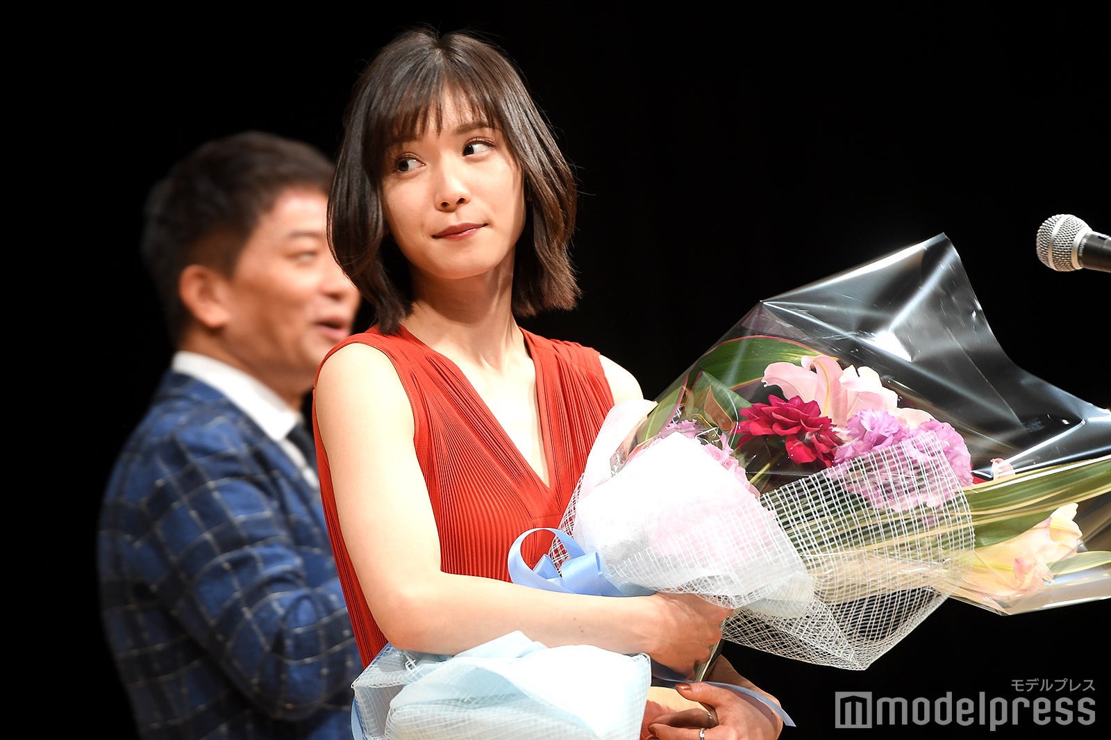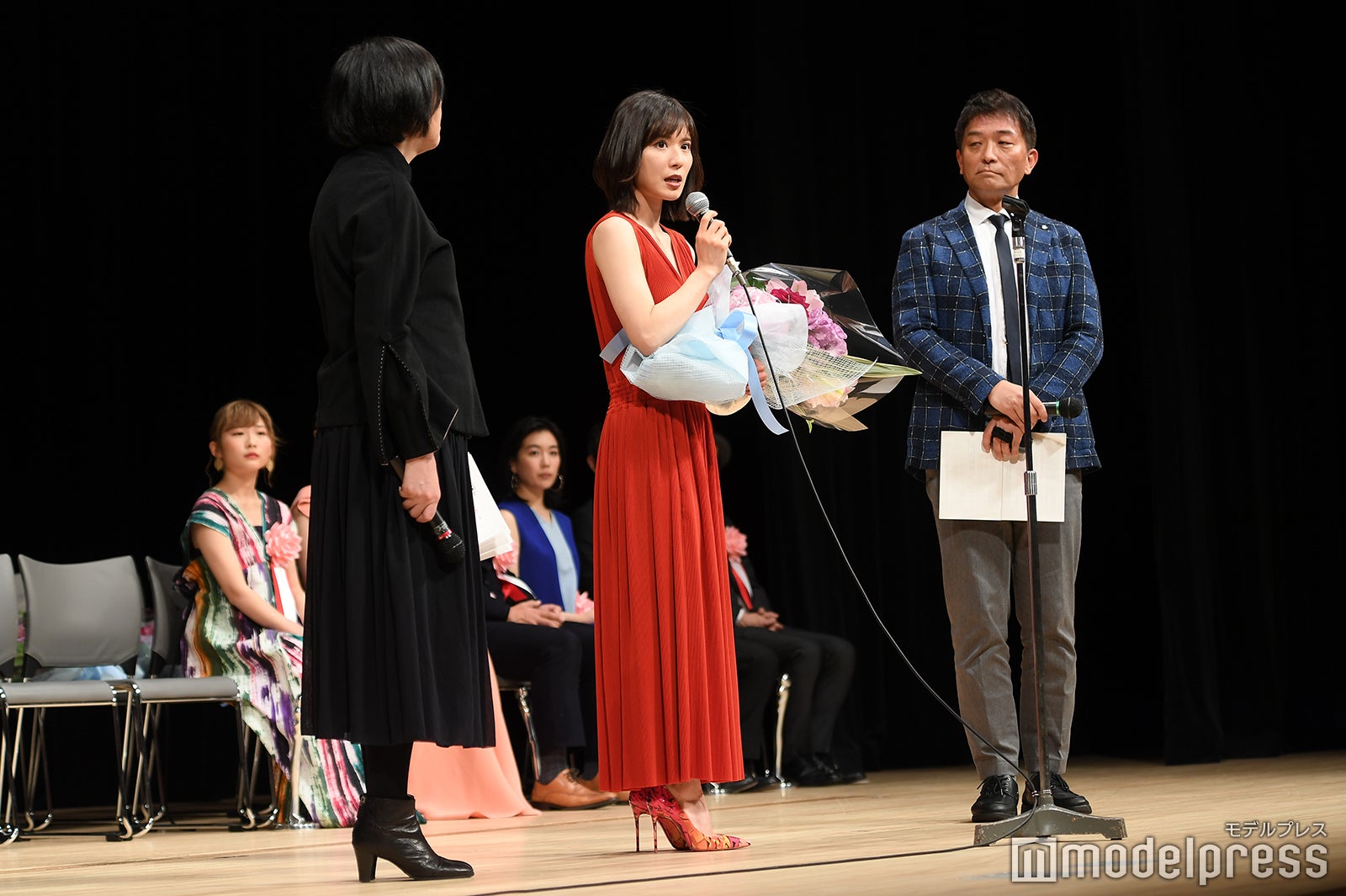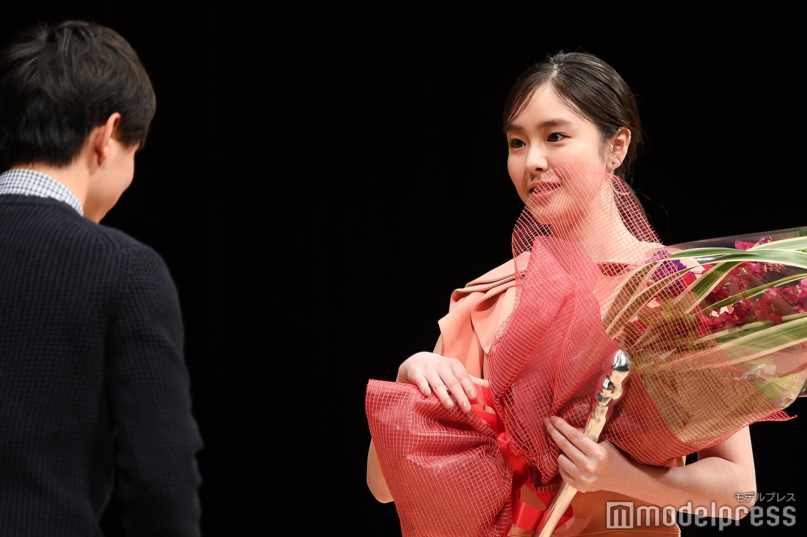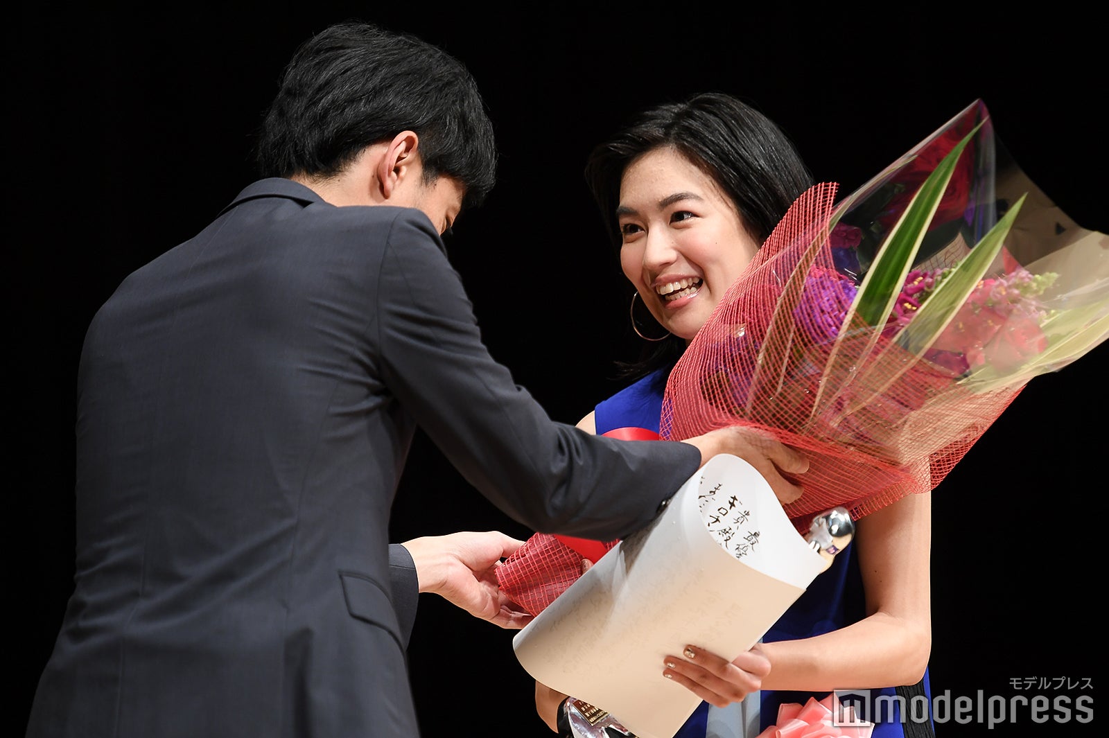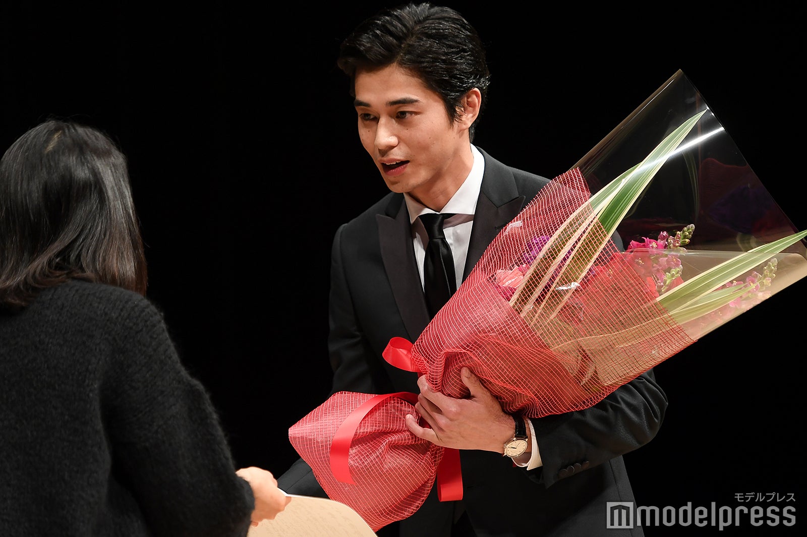 助演男優賞は『孤狼の血』の松坂桃李。スピーチ後に観客が受賞者に直接花束を渡すことが出来るのが伝統。松坂もステージ上から花束を受け取る流れになったが、観客が1階通路を埋め尽くすほど並ぶ異常事態に。これには、5年連続で担当しているMCも「明らかに過去最高ですね」と驚き。表彰式中にもかかわらず、約9分半しゃがんだまま花束やプレゼントを丁寧に受け取り続け、着席の際にはしびれた脚をさするほどだった松坂には、会場から大きな拍手が送られた。