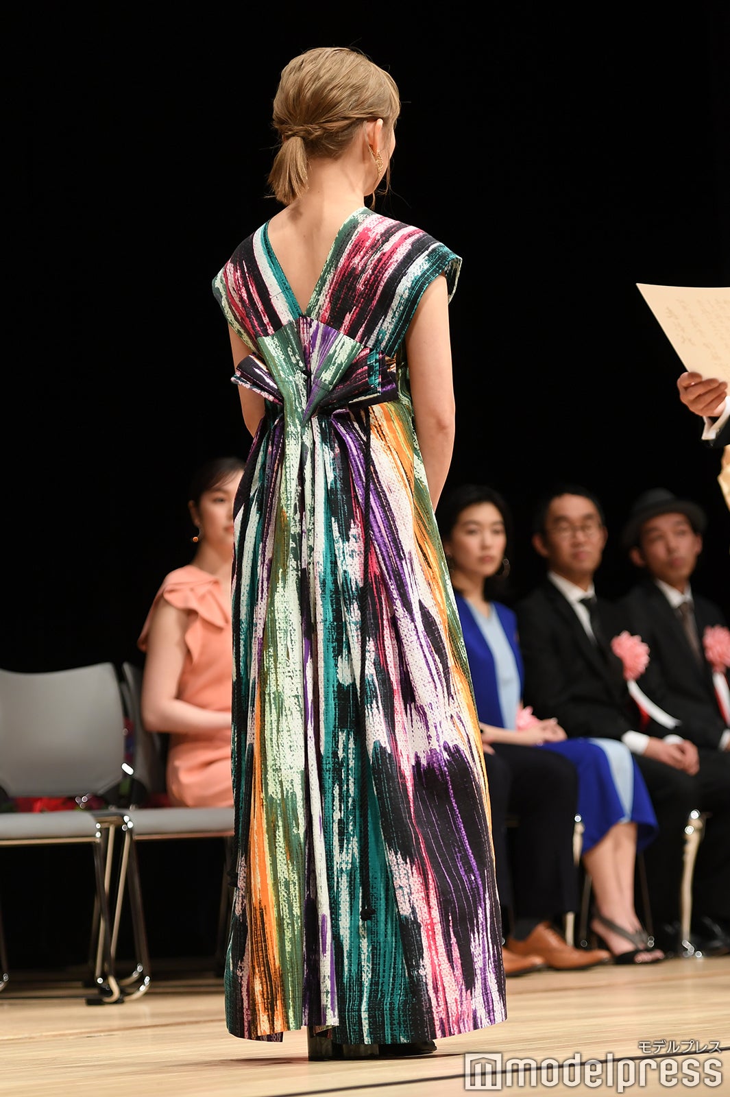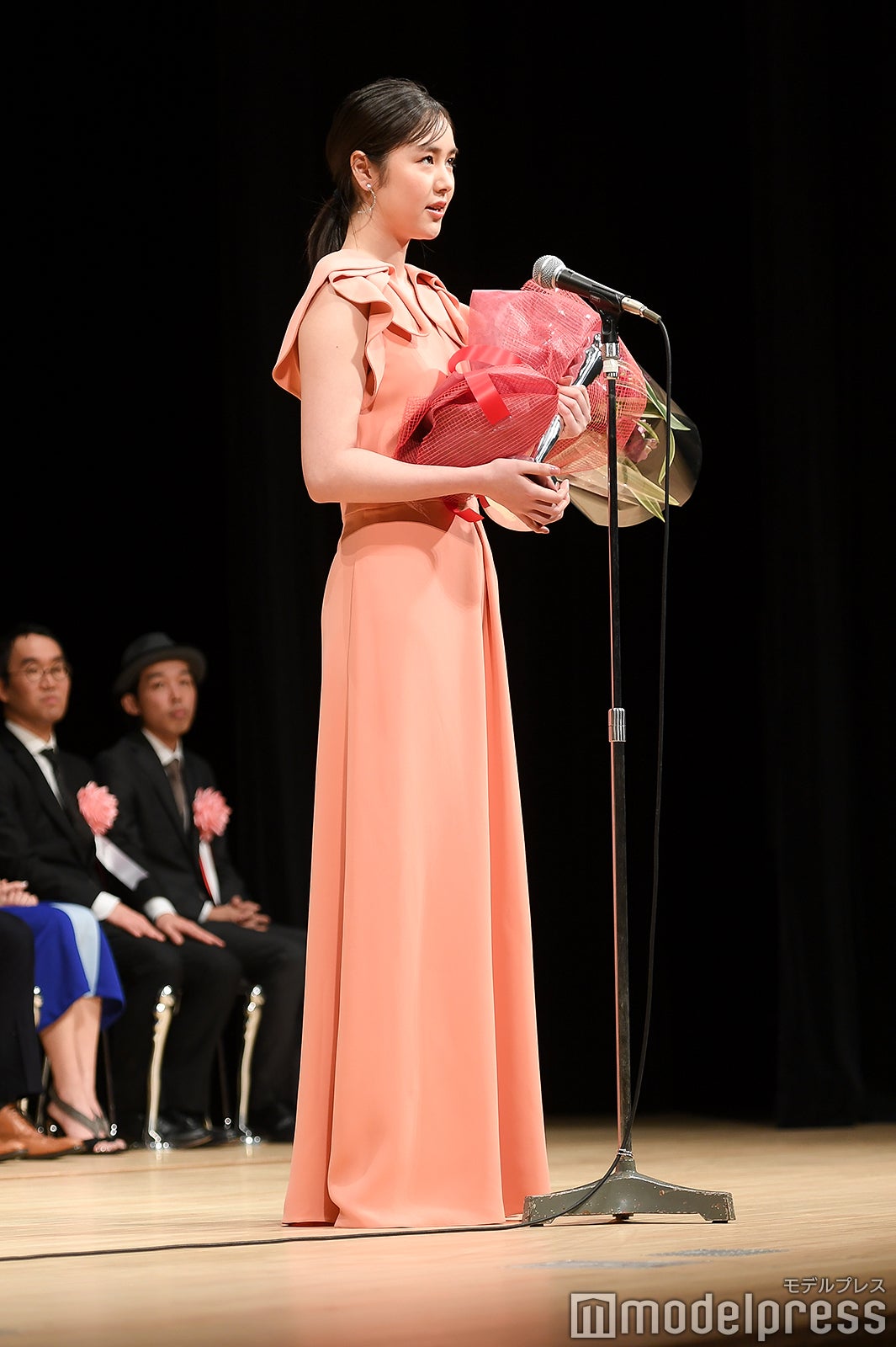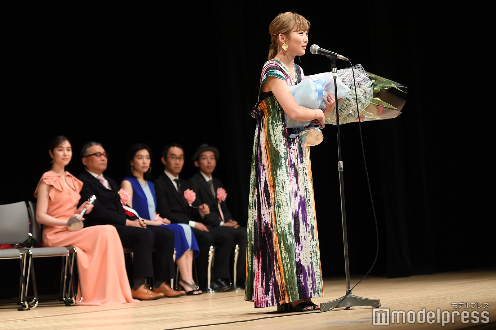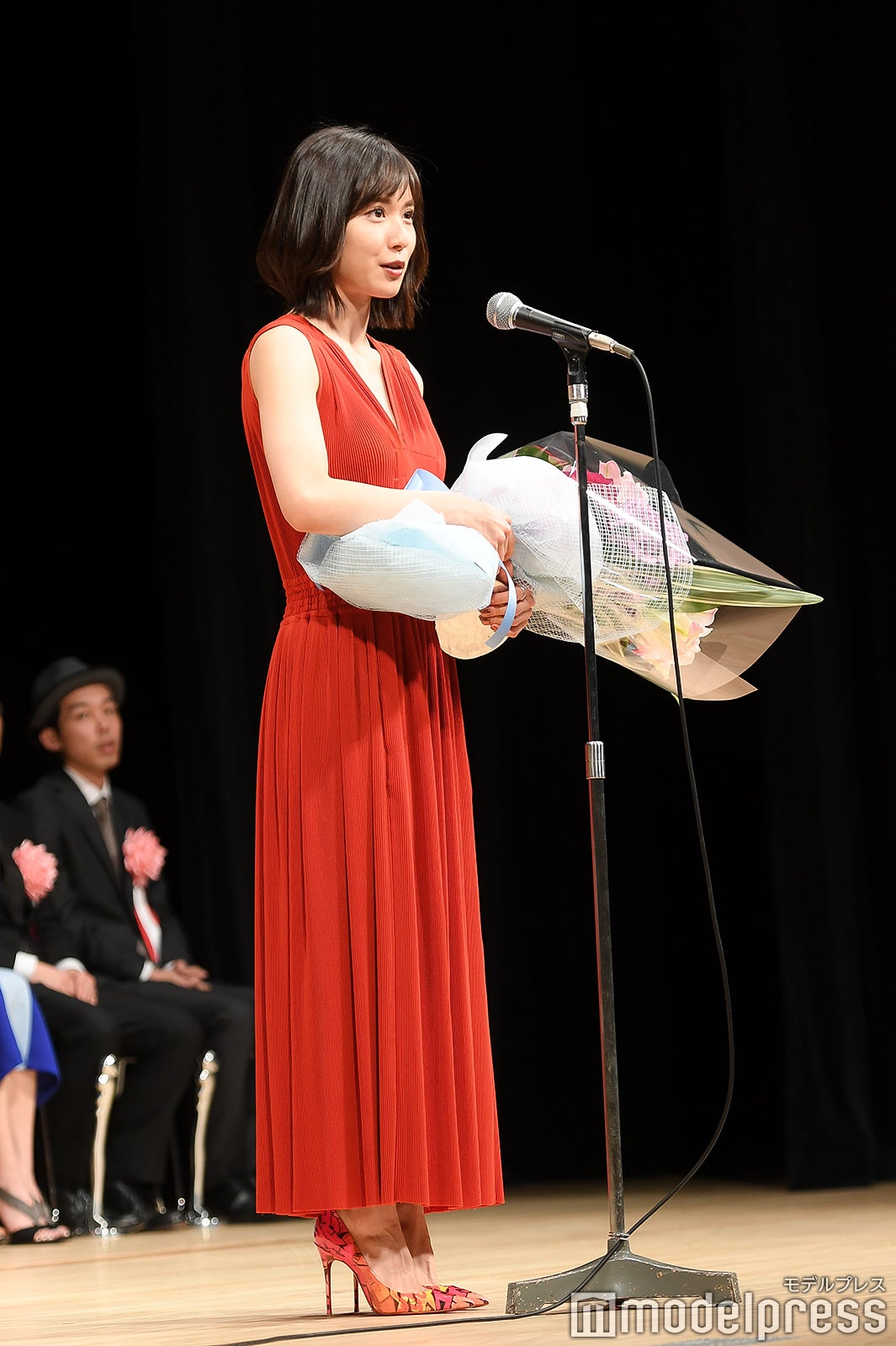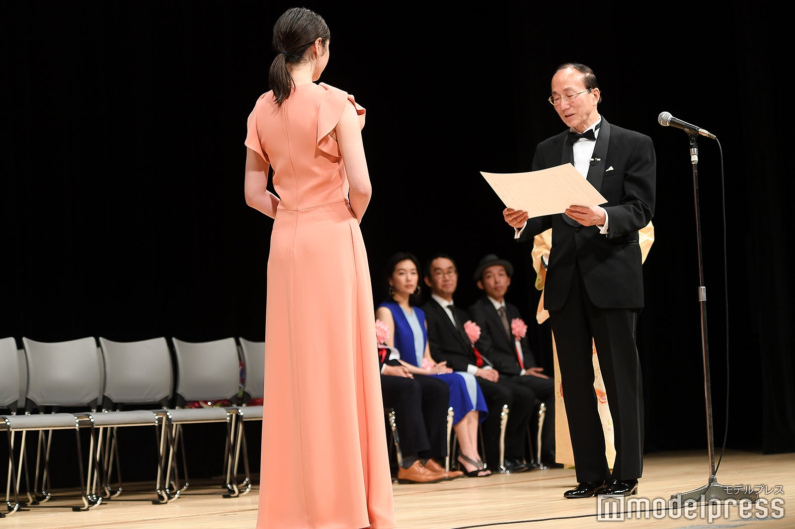 助演男優賞は『孤狼の血』の松坂桃李。スピーチ後に観客が受賞者に直接花束を渡すことが出来るのが伝統。松坂もステージ上から花束を受け取る流れになったが、観客が1階通路を埋め尽くすほど並ぶ異常事態に。これには、5年連続で担当しているMCも「明らかに過去最高ですね」と驚き。表彰式中にもかかわらず、約9分半しゃがんだまま花束やプレゼントを丁寧に受け取り続け、着席の際にはしびれた脚をさするほどだった松坂には、会場から大きな拍手が送られた。