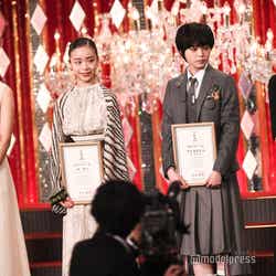 『生きてるだけで、愛。』での受賞となった趣里は、新人俳優賞受賞者のなかでは最年長。「生きてきて映画に何度も救われてきました。これからも感謝とともに、誰かの心に寄り添えられるような人間でいたい。2019年度、新人俳優賞最年少として励んでいきたいと思います」と堂々とスピーチし、プレゼンターを務め、本作で共演した菅田将暉へ向け「菅田さんから盾をもらえて嬉しかったです。たくさん支えてもらいました」と感謝。スピーチを見守っていた菅田は、会場からピースサインを送り、趣里の受賞を祝福した。