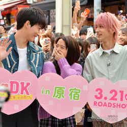 女優の上白石萌音と俳優の杉野遥亮、横浜流星が14日、映画『L・DK ひとつ屋根の下、「スキ」がふたつ。』(・はハートマーク/3月21日公開)のイベントで、女子中高生の聖地である原宿・竹下通りにサプライズ登場した。