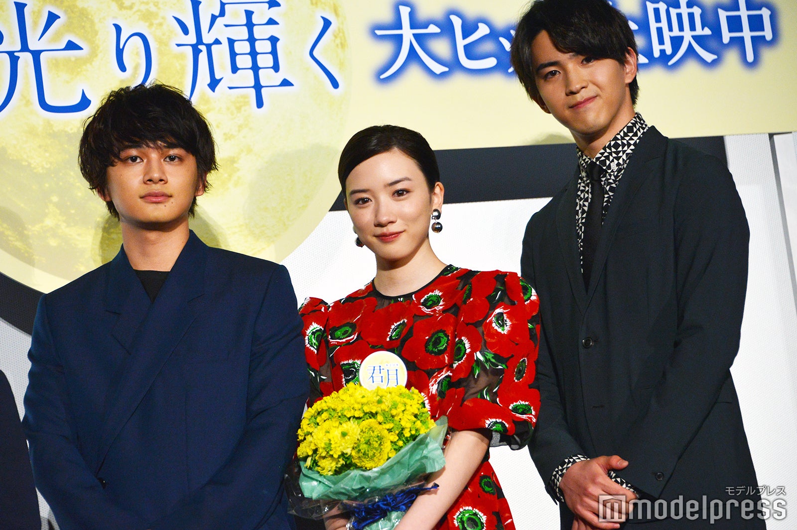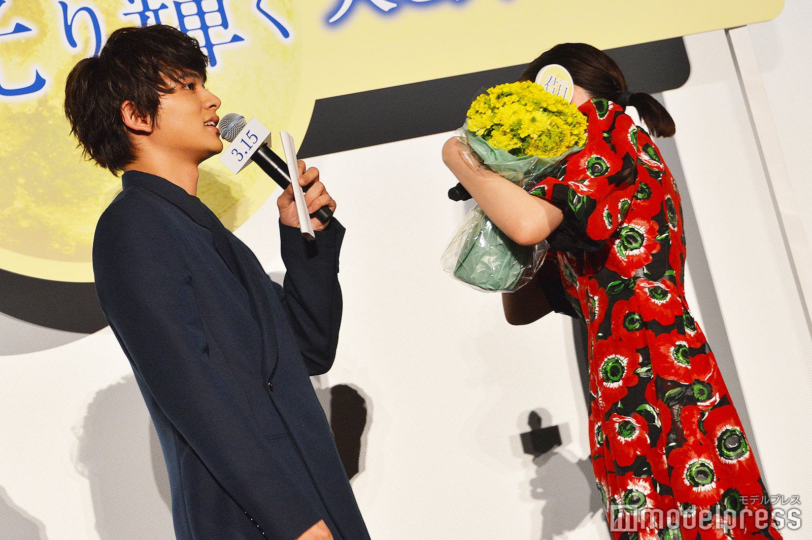 慌てふためく永野を前に、向かい合った北村は「永野芽郁さんへ。今回共演させていただきまして、とてもビックリしました。ハツラツとして見えるけど、俯瞰で自分を見れているし、悩むし、考えるし、それでいてすごい決断力で、前に突き進んでいく。純粋に『この人はすごいな』と思いました。そしてハードなスケジュールが続いてボロボロな僕を見て、何も言わず大量のエナジードリンクをくれたり、僕の気持ちをサラッと代弁してくれたり、男気あるよね、本当に。とにかく相手の気持ちを考えて汲み取ったり感じ取ったりして、自分のことは二の次で生きている芽郁ちゃんにとっての心の拠り所が、この作品であったり現場の空気感、監督、僕を含めた君月チームであってくれたら嬉しいなと思います。あなたを、尊敬しています。常にどっしり構えて、そしていつも変わらない芽郁ちゃんにいろんなことを学んでいます。こんなこときっと言われても、芽郁ちゃんは普通な顔で『はいはい、ありがとう』って聞いてるだろうし、あまりつまらないのはやめます。君は月夜に光り輝くの現場では、本当に太陽のようでした。そして僕が月で、芽郁ちゃんがいれば空気が変わるし、笑顔があふれたり、涙があふれたり、全部を感じさせてくれたのは他でもないあなたです。カメラマンの柳田さんが泣きながらカメラを回しているのも、監督が泣きながらカットをかけるのも、スタイリストの望月さん、ヘアメイクの百瀬さん、キャスト周りを担当してくださった花本さんや、他スタッフさん全員、永野芽郁の表現力に脱帽していました。もちろん、僕も。ありがとうと思っています。本当にありがとう。至極大人な考え方と人間性を持っているのに、まだ19歳。さらにさらに人を魅了する女優になっていくのが、楽しみで仕方ありません。また映画やろうね。それでは、北村匠海でした」と手紙を読み上げると、永野は時折笑みを浮かべながらも、次第に手で顔を覆い隠して涙。大量のフラッシュを浴びるなか「やだやだ!泣いてる顔撮られるの嫌なの~!ちょっと本当に嫌だ、誰かティッシュ~」と永野が涙ながらに叫ぶと、北村がすぐさまハンカチを手渡す。続けて菜の花の花束を渡し、「花言葉は『小さな幸せ』。まみずにピッタリだな、とスタッフさん全員で考えて贈ったものです。小さな幸せを大事にしてください」と声をかけると、永野は「本当にヤバイ!本当に泣ける」と大粒の涙を流していた。
