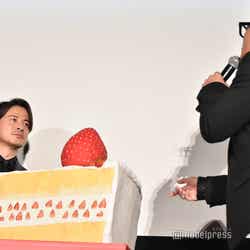 この日のイベントでは、公開を祝う“巨大いちごショートケーキ”が登場。岡田の呼びかけで、宮川がステージ中央に移り、劇中で演じたジャッカル富岡の“ショートケーキネタ”を披露することになった。「大丈夫ですか?」と不安を抱えながらネタを披露した宮川だったが、きっかけを作った岡田は無表情。宮川から「岡田くん笑ってよ」とツッコまれると、「もう1個ネタがあるでしょ?」と、いたずらっぽく笑いながらおかわり。