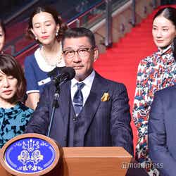 また、キャスト・スタッフを代表して、中井が演じた内閣総理大臣さながらに“所信表明演説”を披露。演説台の後ろに立ち、三谷監督草案の台本を手にした中井は「所信表明演説をしろと言われまして、ここに台本がございます。しかし、私も老眼が始まりまして、字が小さすぎて読めない!」と声を荒らげて笑いを誘った。