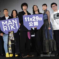 俳優の斎藤工が29日、都内にて行われた映画『MANRIKI』初日舞台挨拶に永野、金子ノブアキ、SWAY、小池樹里杏、三田尚人、清水康彦監督とともに出席した。