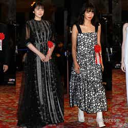 玉城は肩をあらわにした純白のドレスで登場。小松はモノクロのモチーフが際立つ上品なドレス、長澤はブラックのシースルー地に金刺繍のゴージャスなドレスで笑顔を見せた。