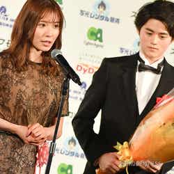 新人賞を受賞した玉城ティナは、純白のセットアップ風ドレスで圧巻の美スタイルを披露。背中が見える肩のデザインと、深く入ったスカートのスリットからは美肌がスラリ。先端がグレーがかったグラデーションのヘアスタイルも目を引いた。松岡茉優
