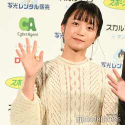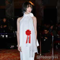 自身が声優を務め、アニメ作品賞を受賞した映画「天気の子」の応援にゲストとして登場した森。10代の新人女優として今後活躍が期待される森らしく、ひざ丈のホワイトのフレアドレスで若々しさをアピール。胸元のブラックの三連リボンもキュートなアクセントとなった。深川麻衣