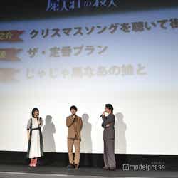 今作は、「このミステリーがすごい!」「週刊文春ミステリーベスト10」「本格ミステリ・ベスト10」と、2017年国内主要ミステリーランキングの1位を獲得し、その後「第18回本格ミステリ大賞」も受賞した、東野圭吾「容疑者Xの献身」以来の、そしてデビュー作としては史上初の4冠を達成した小説「屍人荘の殺人」を映画化したもの。神木が探偵に振り回される探偵助手(ワトソン)を、浜辺と中村が2人の探偵(ホームズ)を演じ、前代未聞の難事件に立ち向かう姿を描く。イベントではプレゼントが入った袋を手にし、客席を回ってプレゼントを配って観客を喜ばせた3人。公開直後の週末ランキングでは実写邦画No.1にランクインし、公開10日間で動員35万人を突破するなどヒットを記録している今作。