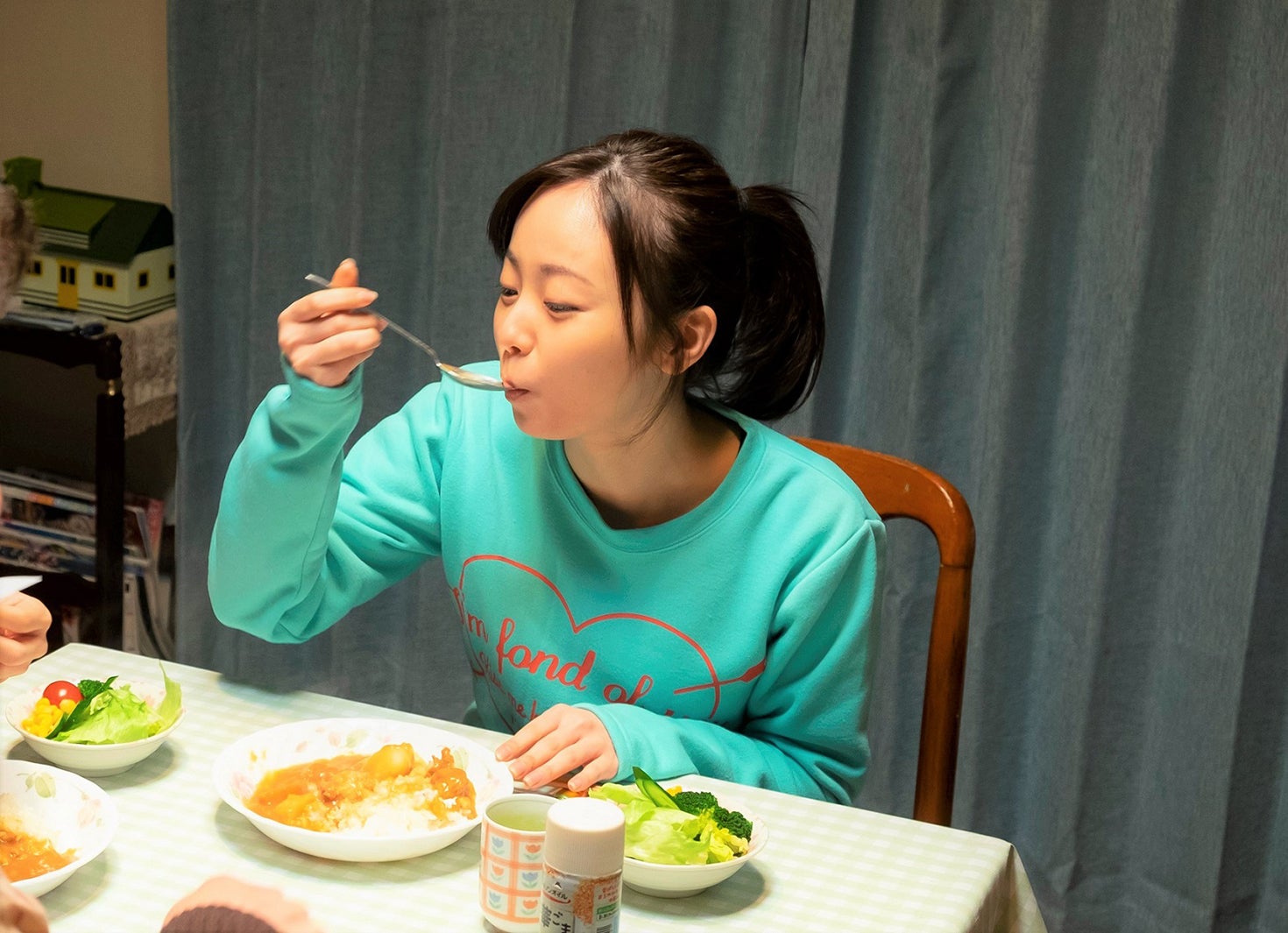 さらに劇中、家族団らんで夕飯を囲むシーンから、ミントカラーのラフなスウェット姿で美味しそうにカレーを頬張る場面カットも公開された。