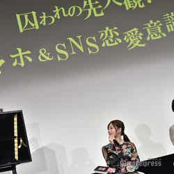 本作では結婚に対して煮え切らない態度の加賀谷と関係をはっきりさせたい美乃里という現代に多く見られるカップル像を演じた2人。イベントでは、トータライザー(アンケート集計機)を使い、会場に集まった約100名の若者たちとSNS時代の恋愛事情をリサーチ。果たして2人の恋愛観はSNSを駆使している若者の恋愛観と一致するのか試した。「SNSで告白するOR告白されるのはアリ?」という質問では、38人がYESと回答したなか、ともにNOの札をあげた2人。