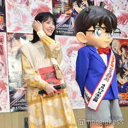 コナン君が見守る中、初めての公開アフレコに挑んだ浜辺。ラスト1シーンを前に会場には「浜辺さん、最後の1シーン頑張ってくださいね!これだけたくさんの人に見守られては緊張してしまいますよね。リラックスしていきましょう」と、物語に登場する新一の声が鳴り響いた。“絶対的なヒーローで理想的な男の子”と、一番好きなキャラクターに挙げる新一からのメッセージに浜辺は「やばーい!汗がすごいですね…」と驚いた様子。その後、山口が登壇すると浜辺は口を抑えながら「汗が止まらないです。中学生くらいの時にお会いしましたが、その時にはすごさをちゃんと分かっていなくて、今ちゃんとした耳と感覚を持ちあわせてお会いできると緊張しますね」と感動を表現した。