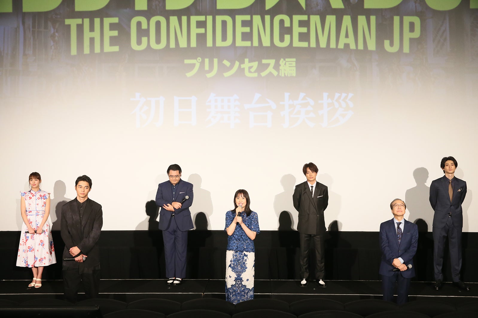 当初の公開予定日から2か月以上の延期を経て、ついに公開初日を迎えた今作。公開館数は全国で344館。初日舞台挨拶の模様はそのうち全国47都道府県の201の劇場に生中継された。全国の“子猫ちゃん(=ファン)”に感謝の気持ちを伝えるために、お馴染みの“コンフィデンスマン”たち・長澤、東出、小日向、小手伸也、そして今作のゲスト・白濱、関水渚、古川雄大の7名が登壇した。