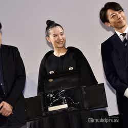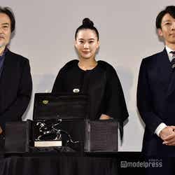 今年9月に行われた「第77回ベネチア国際映画祭」では、銀獅子賞(監督賞)を受賞。日本人の受賞は北野武監督の『座頭市』以来、17年ぶりとなる快挙を成し遂げた。この日は“銀獅子トロフィー”が黒沢監督の手によってお披露目され、多くのフラッシュを浴びた。黒沢監督は「数日前にこれが手元に届いて、なにやら映画の歴史に名前が刻まれたのだと実感が湧いてくる。全員のちから、全員のものだと思っています」とキャスト・スタッフに感謝を伝え、蒼井と高橋は「おめでとうございます」と改めて祝福した。