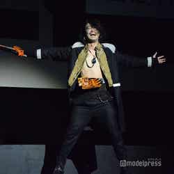 舞台上で「変身」も披露した伊藤は、「歴代のゲストライダーは自分で(変身ポーズを)考えると聞いたんですが、監督たちにお願いして作っていただいたので宝物になりました」と満足気。「変身できる喜びで手が震えて泣きそうになったんですが、恥ずかしくて笑ってごまかしました」と撮影中の裏話も明かして笑いを誘った。