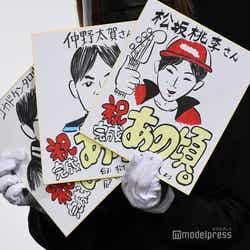 松浦亜弥推しの劔を演じた松坂は、「ありがたいことに劔さんが現場に来てくれた。劔さんがスタッフさんと談笑する姿、一人で見守ってくれている佇まい、日常のニュアンスを垣間見ることができたのがよかった」と役のモデルとなった劔氏を観察。さらに「劔さん結構来てくださったので嬉しい反面、やっぱり緊張しましたね」と振り返った。劔氏は自身を演じた松坂に手紙をしたためており「僕と松坂さんの外見の違いを1番気にしていなかったのは松坂さん本人だった。内面から僕と向き合っていいところ、悪いところを演じてくれた」と感謝。さらに色紙に描いた松坂、仲野、コカドの似顔絵もプレゼントした。松坂は「めっちゃ嬉しいです。帰ったら速攻飾ります」と喜んだ。