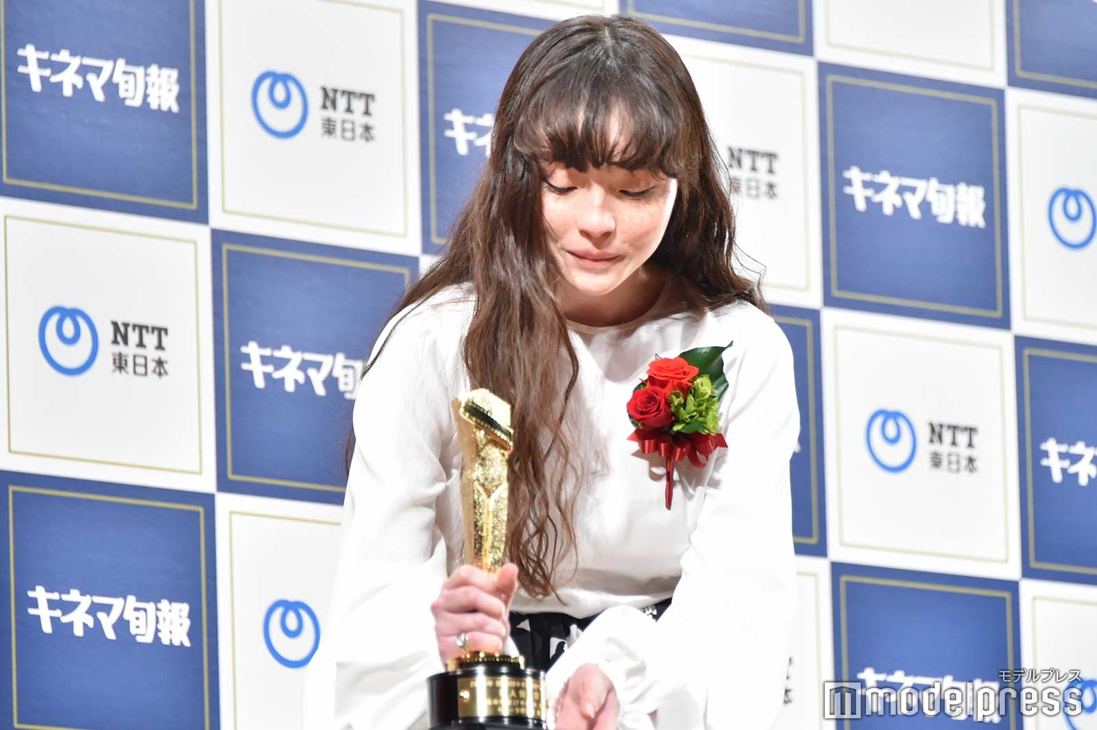水川はトロフィーを受け取ると「こんな歴史のある賞を頂けて嬉しく思っています」と話し、「喜劇 愛妻物語」について「話を頂いたときに本当にすごくこの役にビビビッと運命的なものを感じて絶対に私がやりたい、と思って2020年関わってきた作品なのでご褒美を頂いた気分です」と喜びのスピーチ。この日、客席で見守った足立紳監督が表彰式前に楽屋に訪れたそうで、「(『キネマ旬報』の)本をじっと見て『これは嬉しいな、宝物だな』とおっしゃって下さってすごくグッと来たんですけど、言うのは恥ずかしくて抑えました」と感慨深い表情。「これからも味わいのある作品に沢山長く関わっていける女優になれれば」と今後の活躍も誓った。