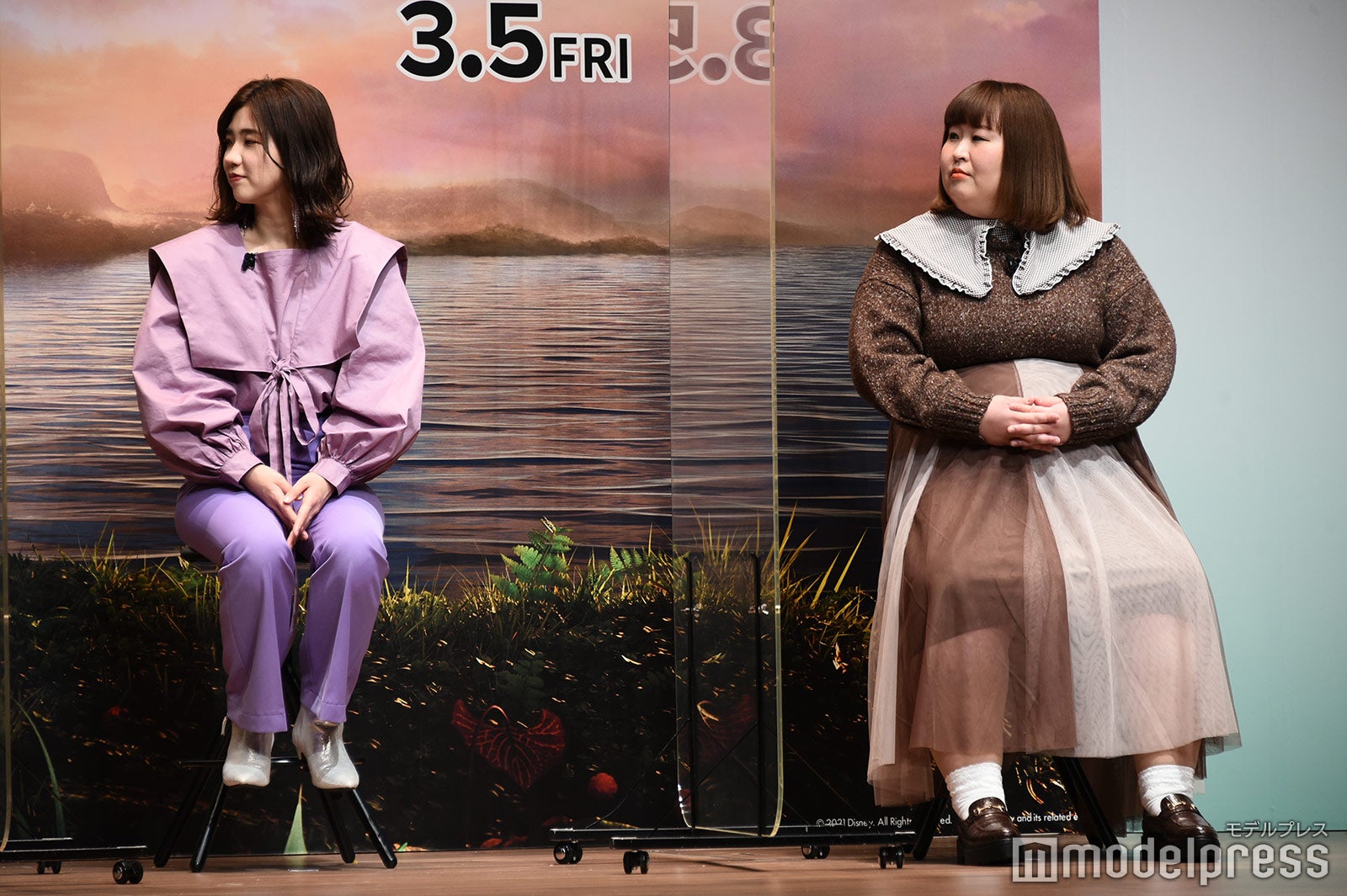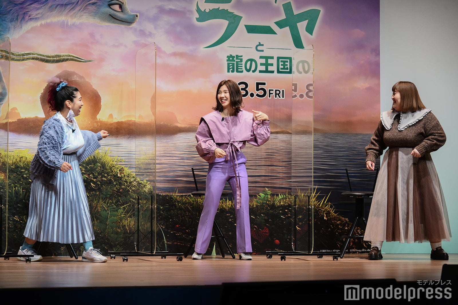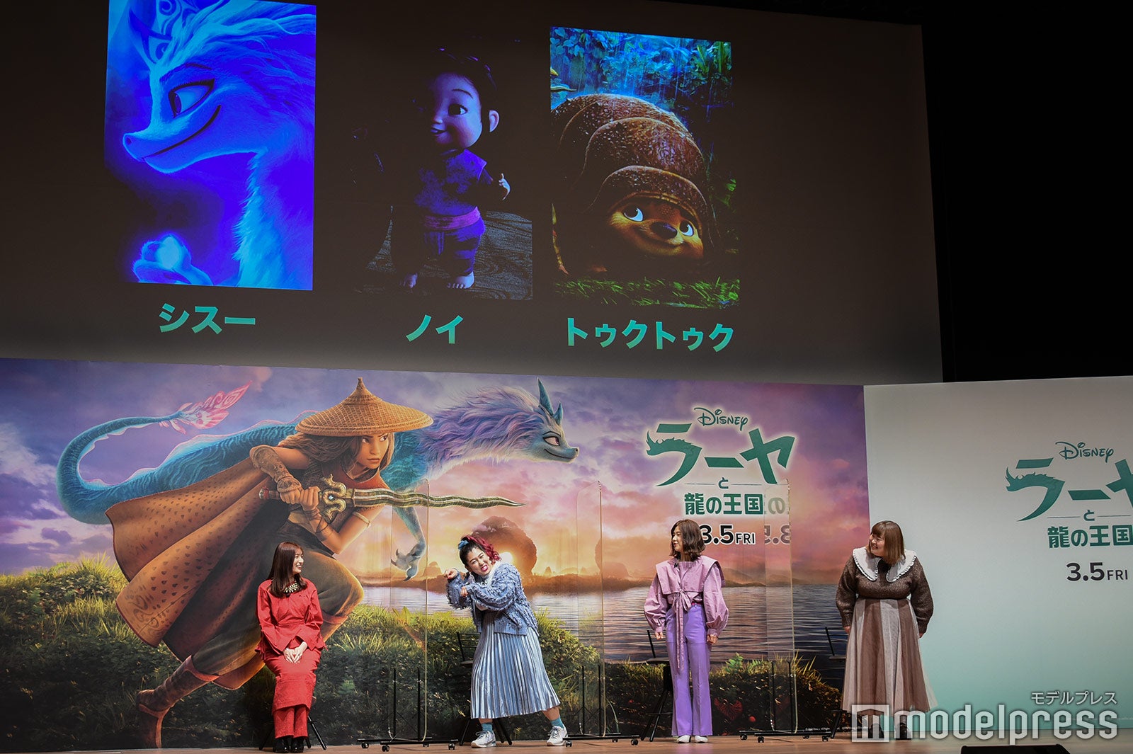 声を当てたラーヤは「人を信じられなくなった女の子だけど、心が強い。魅力的でかっこいい女性」と紹介し、自身と似ている点については「私は初めて会う方に慎重になり過ぎるところがある。『この人本気で言っているのかな?』って疑って考えてしまうところがあって。そこが1番ラーヤのことがわかるなと感じる共通点なのかな」と語った。また、好きなディズニーヒロイン・アリエルとは「好奇心旺盛な部分が似ている。そこが一番好きな部分でかっこいい」とした。3時のヒロインの福田麻貴は、一足早く映画を見て「ラーヤの声がイメージのまんま。マジでプリンセスだった。声に芯がある」と絶賛。褒め言葉を聞いた吉川はその場で無言でガッツポーズをし、喜びを表した。