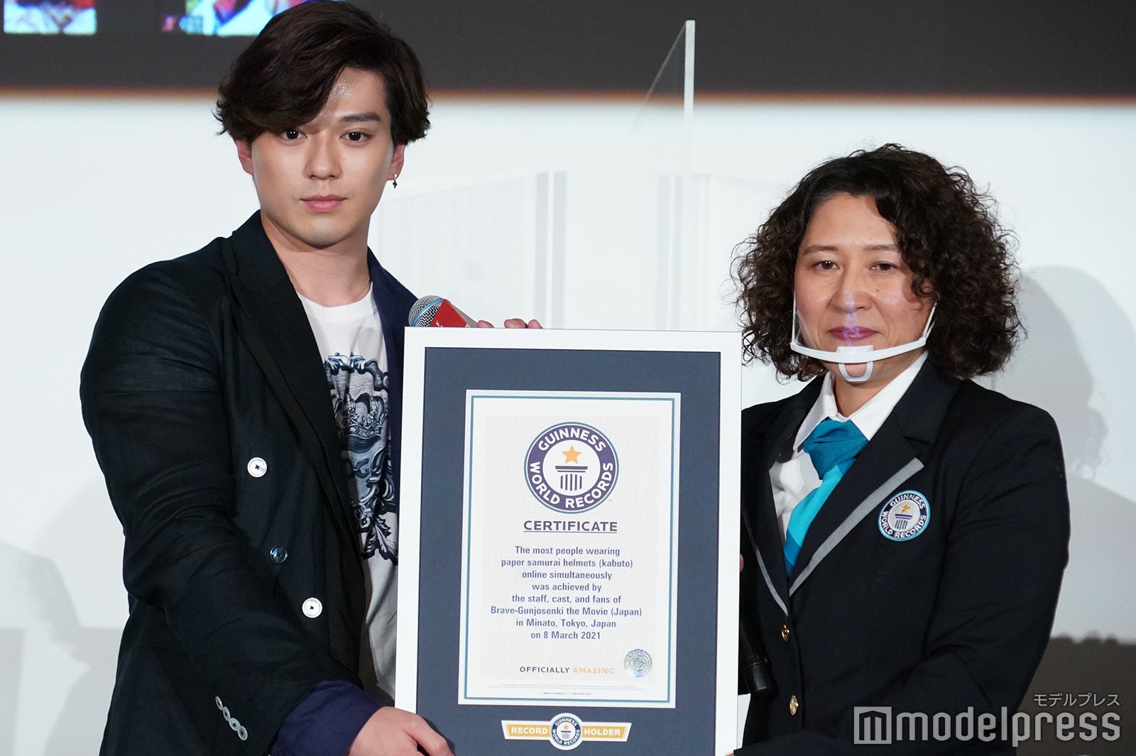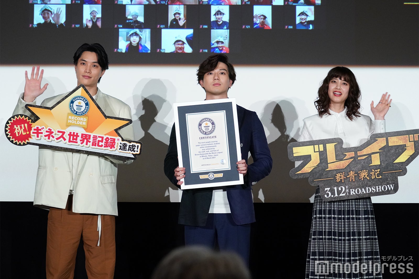 俳優の新田真剣佑、劇団EXILEの鈴木伸之、女優の山崎紘菜が8日、都内にて開催された映画『ブレイブ ―群青戦記―』(3月12日公開)の「青春ぜんぶ懸けてギネスに挑め!イベント」に出演し、ギネス世界記録を樹立した。
