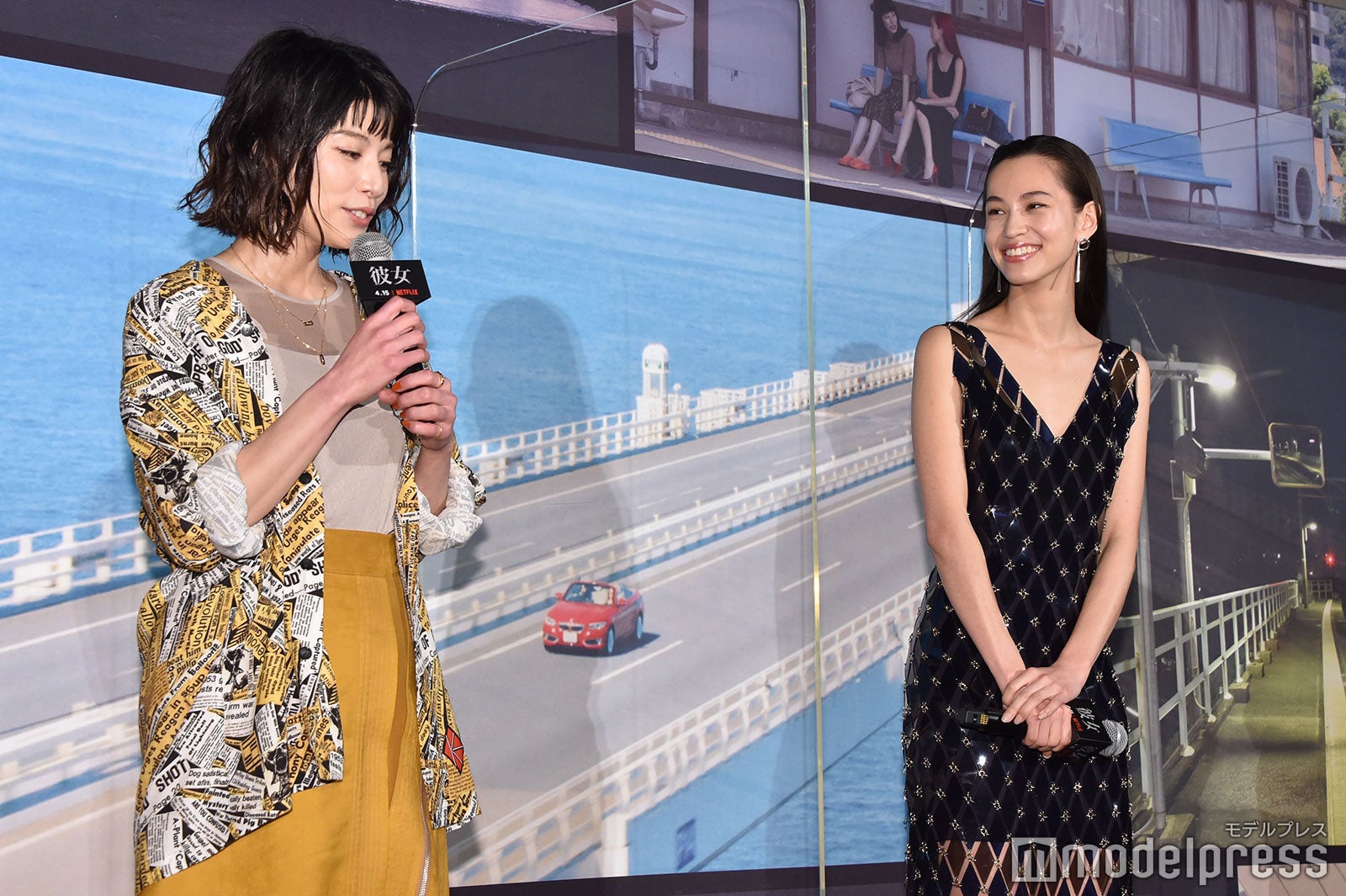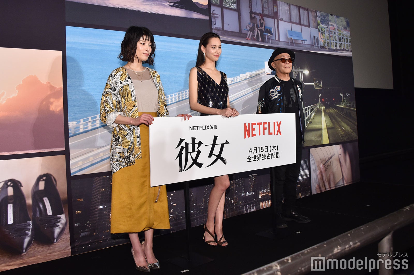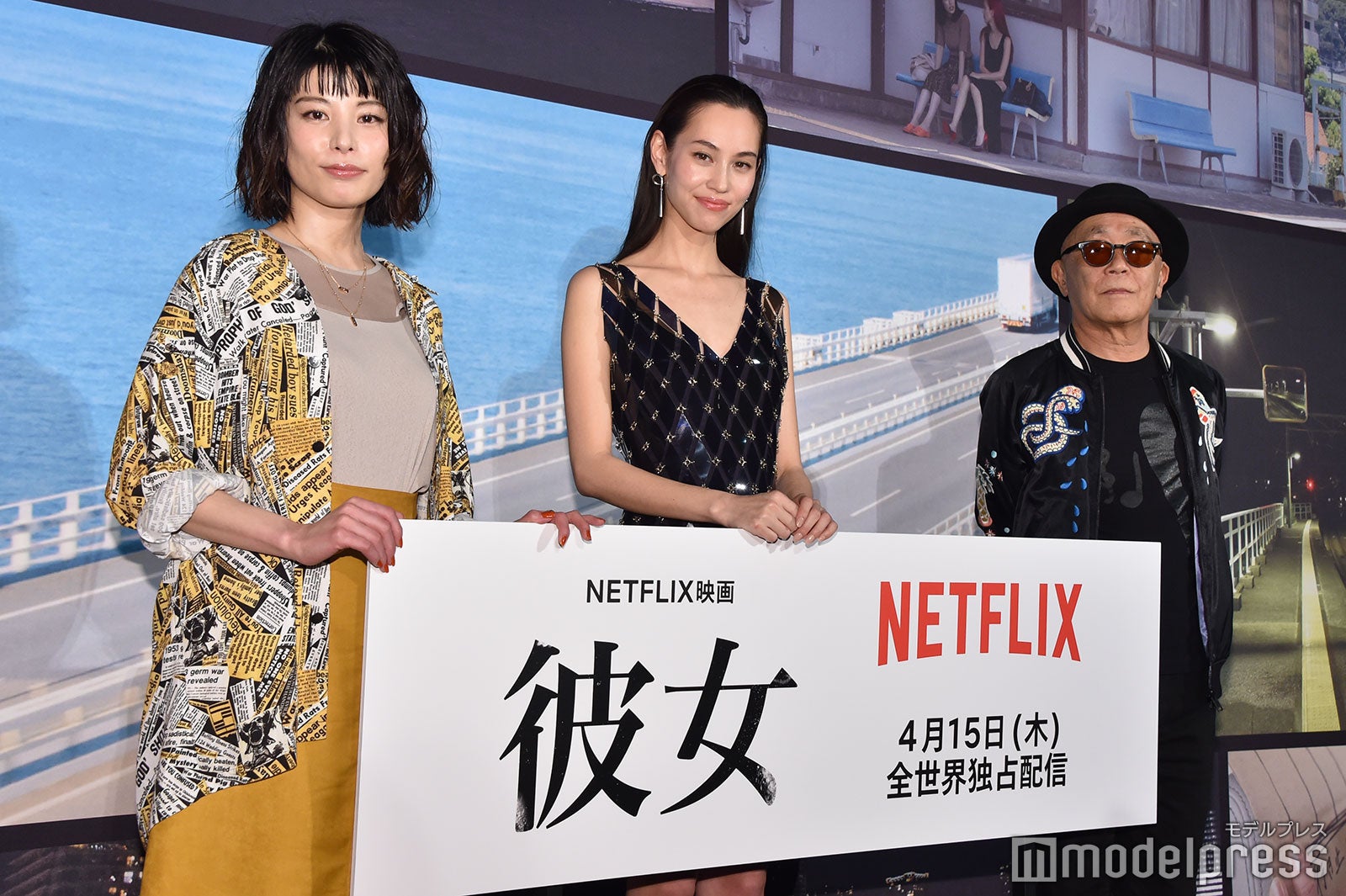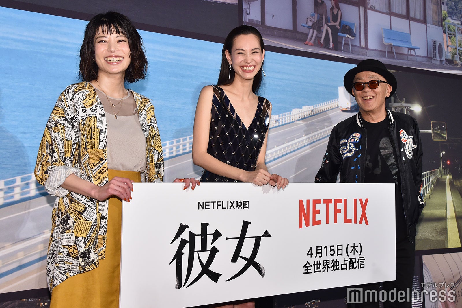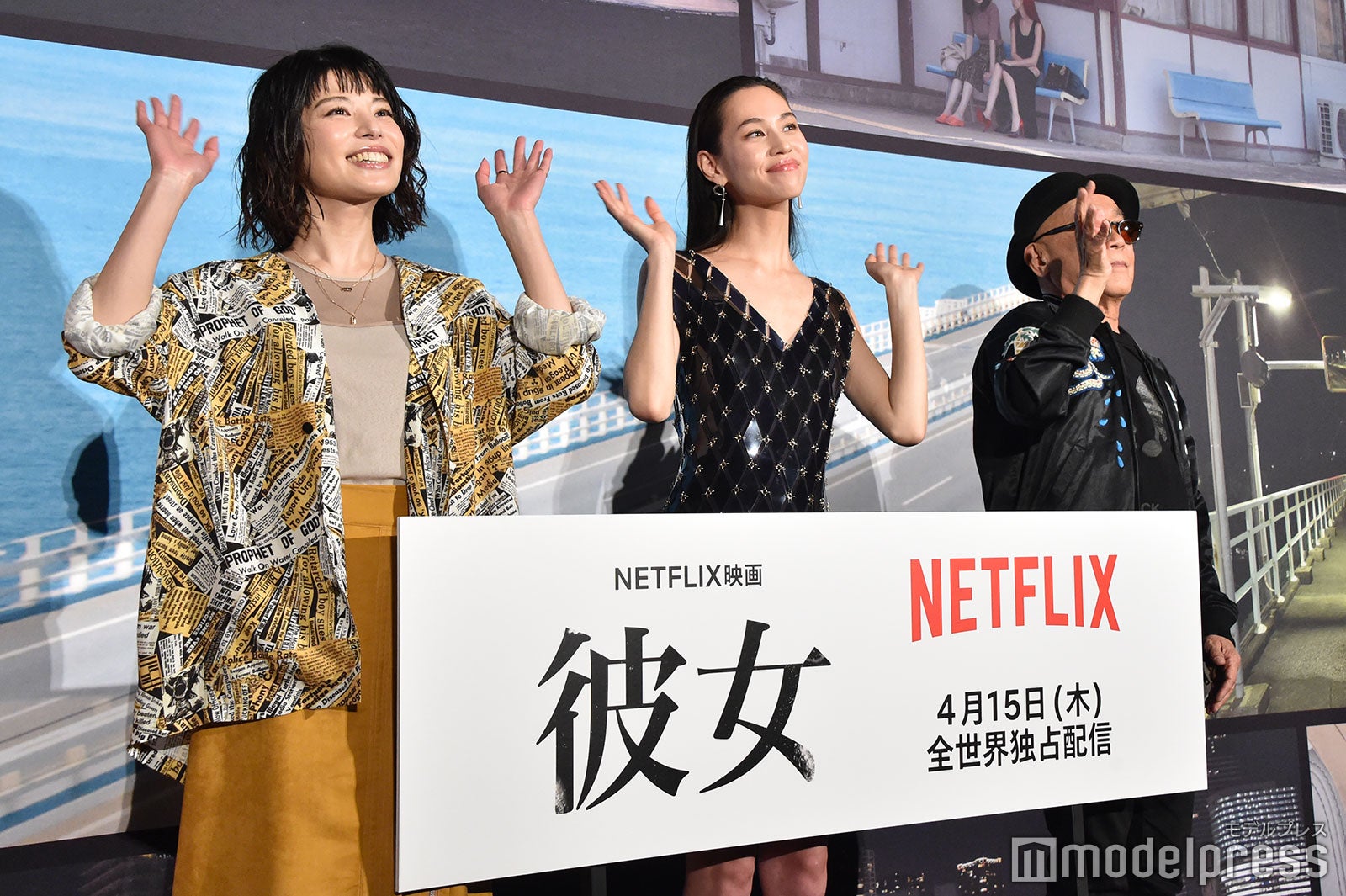 モデルで女優の水原希子とロックバンド「ゲスの極み乙女。」のドラマー、ほな・いこかこと女優のさとうほなみが13日、都内で行われたNetflix映画『彼女』(4月15日より配信)の配信直前イベントに、メガホンをとった廣木隆一監督とともに出席した。